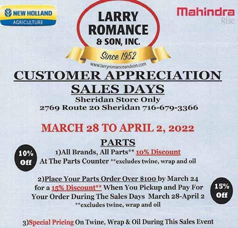 2 MARCH 10, 2023 ERIE CATTARAUGUS CHAUTAUQUA COUNTY COMMUNITY SOURCE Fish Finder Only $15.50 + tax WE DELIVER 716-934-7235 LENTEN FISH FRY ELLIE’S DELI 201 Central Avenue, Silver Creek Includes French Fries, choice of Potato Salad, Macaroni Salad or Tuna Macaroni Salad PIZZA • WINGS • SUBS • FINGERS & MORE FOR EDITORIAL CONTACT: submit@fredoniapennysaver.com CLASSIFIEDS SERVICES SPRING CLEAN-UP Winter home repair, yardwork cleaned, removal of leaves, brush and trees. Appliances, furniture & more. Attics, basements & garages cleaned. Senior/Handicap discounts. Tear downs - trailers, houses, garages, barns, sheds etc. 716-679-6272 DKSC3.3.23 Commercial & Residential CLEANING, SERVICE AND INSTALLATION FURNACES, BOILERS, AIR CONDITIONERS, HOT WATER TANKS, DUCT WORK, SPLIT SYSTEM, AND GAS LINES Services: OIL, PROPANE AND NATURAL GAS 716-296-1022 www.dmheatingcooling.com 534 Maple Ave. Cherry Creek, NY 14723 Lincoln Arms Housing 430 Main Street, Dunkirk, NY 366-1613 For Your Senior Housing Needs ACCEPTING APPLICATIONS SALE Look for the Green Tag Sale! Huge savings on “one of a inventory clearance! Patton’s Lighting Center 10378 Bennet Rd., Fredonia, NY 716-672-4365 HOURS: Mon - Sat 9:00AM - 5:00PM Now through March 31, 2022 Water Well Drilling: •Domestic, Farm, Municipal •Repair & Increase Old •Well’s Flow Water Pumps: •Sales & Service •Complete Installations WE GUARANTEE WATER IN WRITING Year Round Service - Free Estimates 104 Main St. Silver Creek 1-800-427-7687 716-934-2658 ehmkewelldrillersinc.com Locally Family Owned and Operated Since 1929 Water Conditioning: •Water Softeners •Acid Neutralizers •Sediment Filters •Iron Removal Filters •Chlorinators •Sulfur Removal Filters •Ultra Violet Lamps Submit news, photos, announcements, etc. to: SUBMIT@ FREDONIAPENNYSAVER.COM FOR SALE