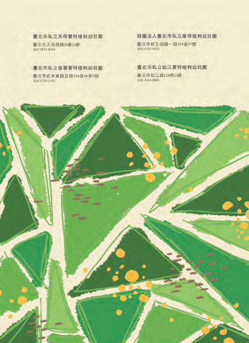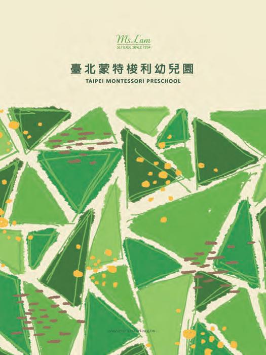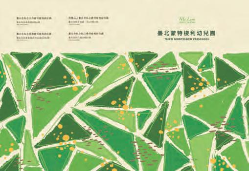 蒙式教具中的 「 構成三角形 」 是構成所有幾何圖形的基礎 , 封面選用此形象搭配企業色與手繪質感 , 象徵孩子 浩瀚的成長之旅將在台北蒙特梭利引導下開始萌芽 。