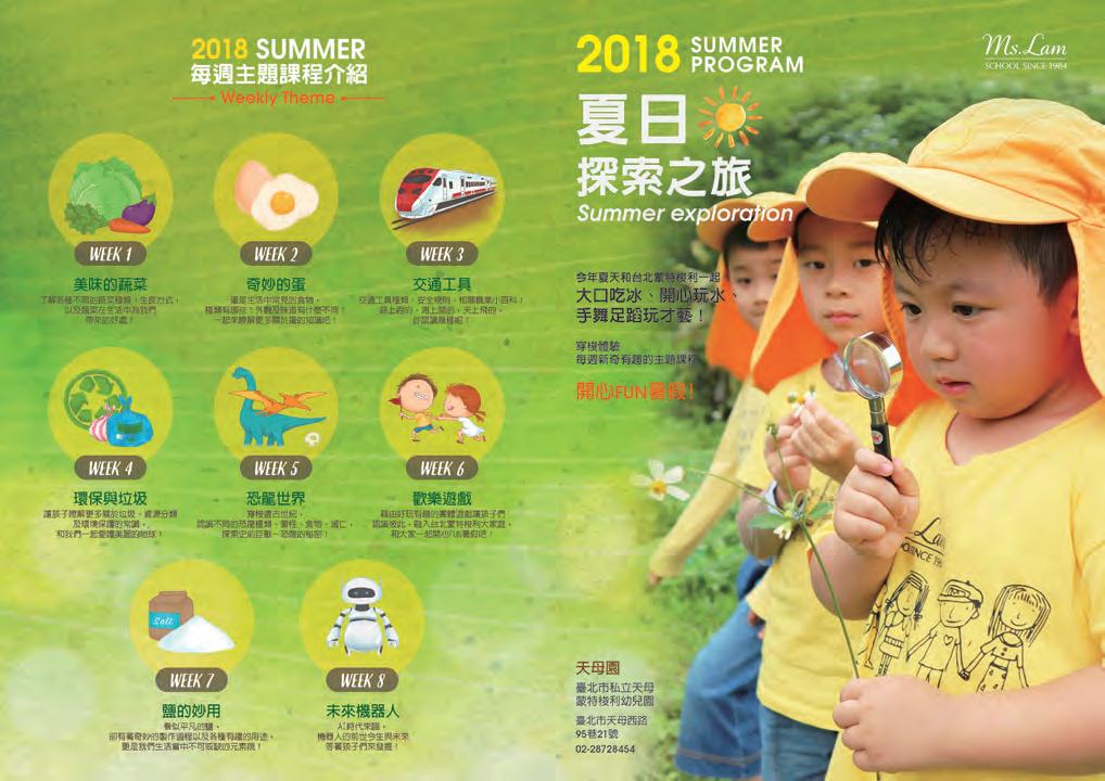 2018年暑期班各分園為孩子們企劃了每週不同主題的課程 , 遂在設計時 , 鎖定以 「 探索 」 為核心概念來統整 孩子即將開始的新奇體驗與多元課程項目 ,