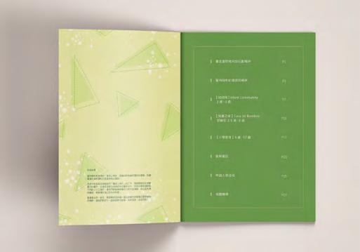 故事內容分為三大主題 , 整體以手繪質感和溫馨可愛氛圍來做系統性視覺規劃 。 編排時考量到此書為橋 梁書 , 謹慎調配了各篇章圖文比例 , 進入各主題時配有滿版扉頁提示 、 在關鍵劇情處編置大幅插圖刺激