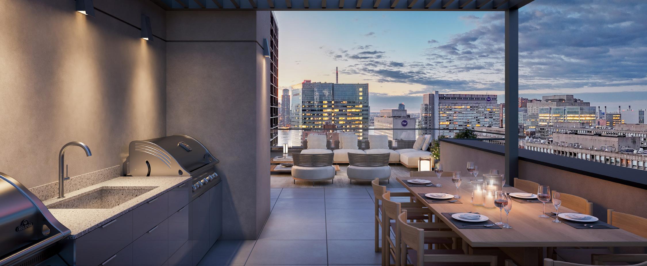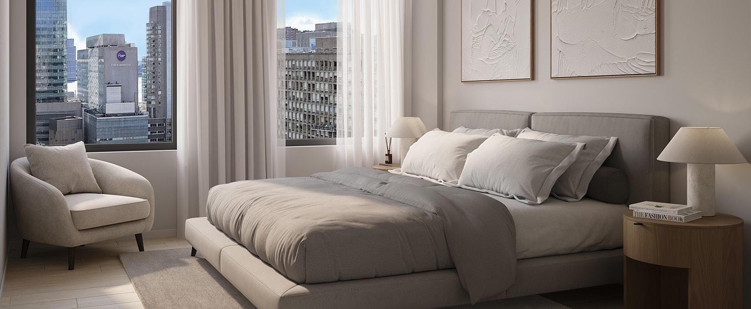 Penthouse D is a one-of-a-kind luxury penthouse, featuring a 2-bedroom, 2-bathroom, 1,377-square-foot triple corner home with a private outdoor loggia. It features 15’+ ceilings, an oversized kitchen with chef ’s island, and sweeping South, East, and North views encompassing iconic New York City vistas and landmark architecture.