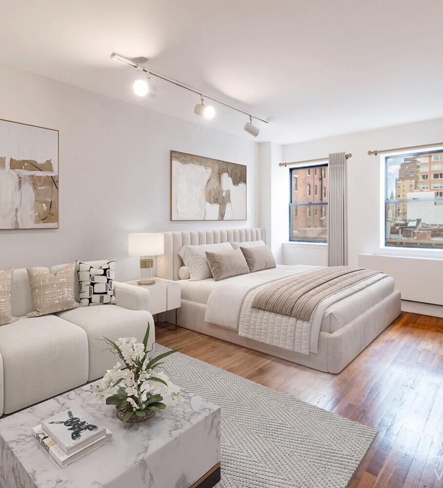Residence 21A is a spacious 1-bedroom - 1 bathroom 592 square foot corner home with 10’ ceilings. It features a marbled bathroom, North facing exposure, terrific closet space, outstanding light, and floor-to-ceiling windows.