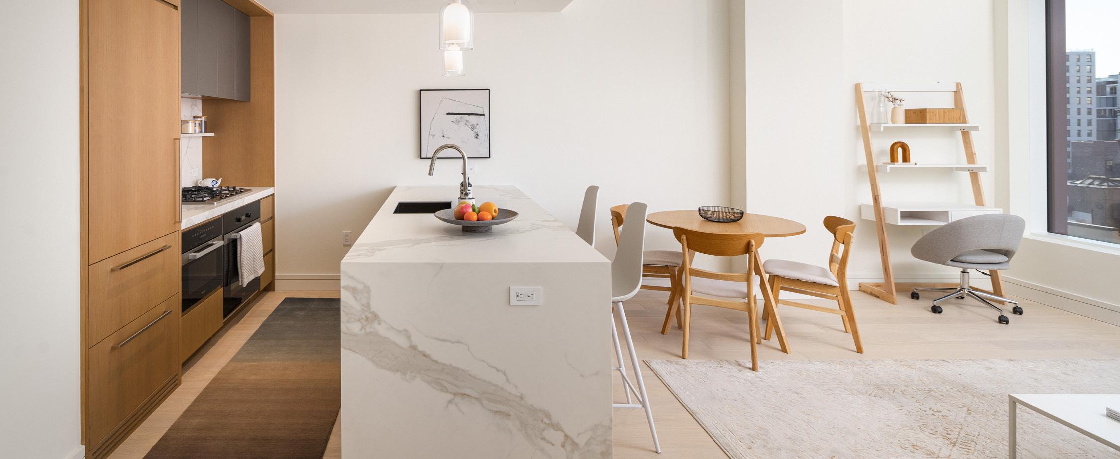 Residence 3G is a generous 713 square foot corner home with separate home office and 10’ ceilings. It features a marbled bathroom, South and West facing exposures, terrific closet space, outstanding light, and floor-to-ceiling windows. Designed by Neri&Hu, the kitchen emphasizes tranquility, with clean, vertical lines and the use of natural materials to create a serene ambiance.