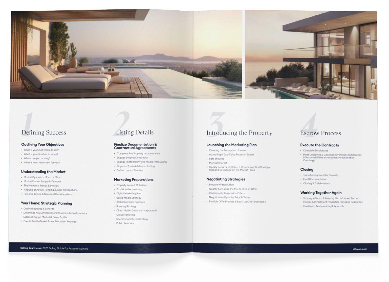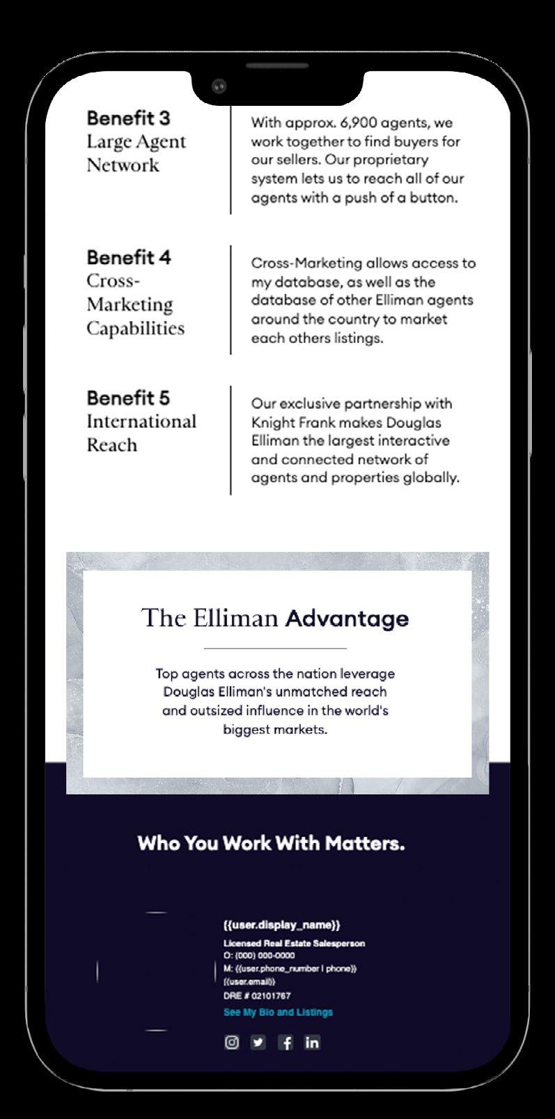 Agent Name Realtor® | DRE# 00029849 M 000.000.0000 O 424.203.1800 agent.name@elliman.com 3701 Highland Avenue, #200 Manha an Beach, CA 90266 elliman.com © 2023 DOUGLAS ELLIMAN REAL ESTATE. EQUAL HOUSING OPPORTUNITY. 150 EL CAMINO DRIVE, SUITE 150, BEVERLY HILLS, CA 90212. 310.595.3888. DRE# 01947727. I know what it takes to sell a home. Many sellers are taking advantage of this market before it’s too late to get the maximum value for their home. Once you scan for your home value estimate, call me today and we can get started. Who you work with ma ers. Scan QR code for your instant home valuation estimate— results in seconds! Back Week 1 Week 2 Week 3 Week 4 Week 5 Customizable Characters Max) Contact Details Optional) With approx. 6,900 agents, we work together to find buyers for our sellers. Our proprietary in-house system allow us reach out to all our agents with a push of a button. The Power of Elliman: 5 Brokerage Benefits #3 Large Agent Network Benefits 1. Experience #2. Public Relations 3. Agent Network 4. Marketing 5. International Reach With the #1 Public Relations team in Real Estate, our relationships with major media outlets allow us to get the proper coverage your home deserves. The Power of Elliman: 5 Brokerage Benefits #2 Power of the Press Benefits 1. Experience #2. Public Relations 3. Agent Network 4. Marketing 5. International Reach Cross-Marketing allows access to my database, as well as the database of other Elliman agents, whether in California or across the nation to market each other’s listings. The Power of Elliman: 5 Brokerage Benefits #4 CrossMarketing Benefits 1. Experience #2. Public Relations 3. Agent Network 4. Marketing 5. International Reach Our exclusive partnership with Knight Frank makes Douglas Elliman the largest interactive and connected network of prime and super prime residential agents and properties around the world. The Power of Elliman: 5 Brokerage Benefits #5 International Reach Benefits 1. Experience #2. Public Relations 3. Agent Network 4. Marketing 5. International Reach Backed by over a century’s worth of expertise in key markets across the country, Douglas Elliman has the reach and resourxes to promote your property from coast to coast. The Power of Elliman: 5 Brokerage Benefits #1 Local Insight, National Scale Benefits 1. Experience #2. Public Relations 3. Agent Network 4. Marketing 5. International Reach