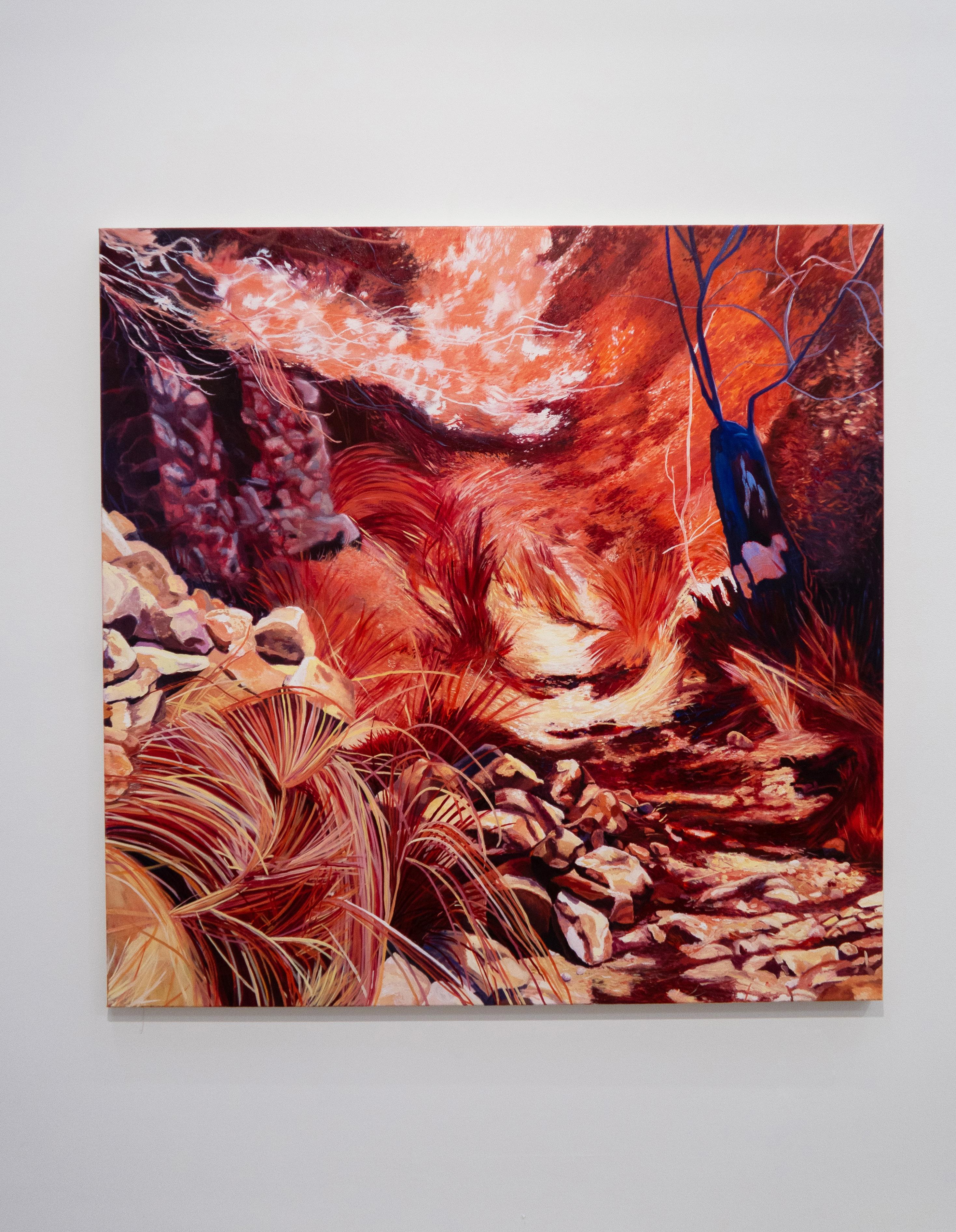 Walking into this space, I’m immediately struck by the oil paintings and their “vibrant meditations on nature.” Referencing her own photographs, Melinda creates vast environments that invite viewers to enter a “psychic wilderness” and feel the radiance within each work.