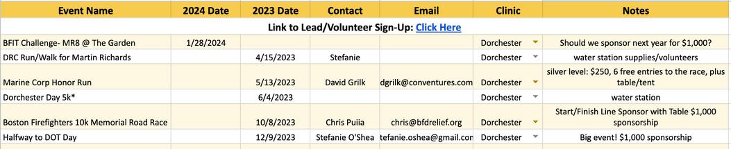 Once an event lead is identified, they, alongside the CM/OM team should ensure that this sign-up sheet linked within your clinic’s tab on the 2024 Events Calendar is updated. This is how we know which events are fully staffed or aren’t.