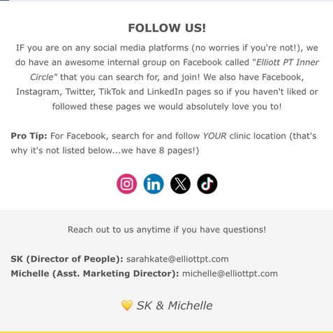 Promote Elliott PT and profession of physical therapy in regards to injury prevention, rehabilitation and performance training