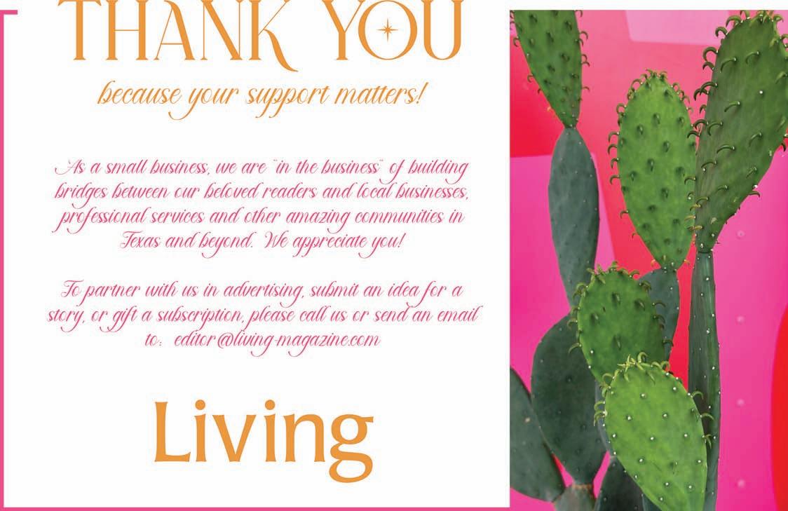 No portion of EllisCountyLivingMagazineshall be reprinted in any other publication without permission. The views expressed herein should not be construed as medical advice. Please consult your physician.