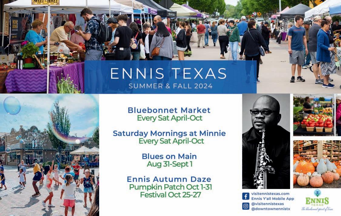 For more information about the Bluebonnet Market, our parks, restaurants and upcoming events, download our free mobile App “Ennis Y’all” and visit vistennistexas.com. For a comprehensive guide to all the fun in Ennis, scan the QR code to download our new travel guide, Adventure to Ennis.