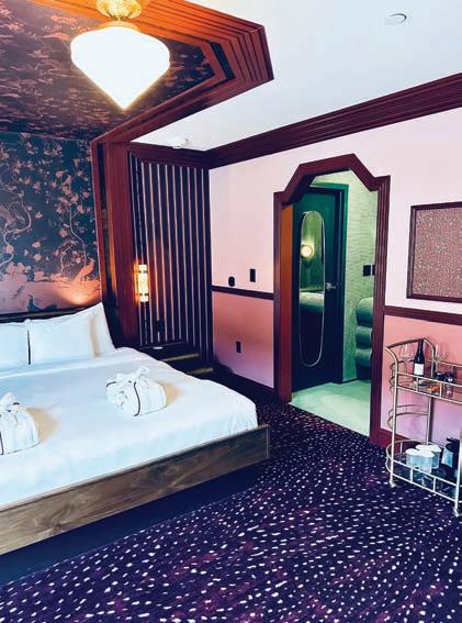 The grounds are artistically landscaped and maintained well with lush green plants, agave gardens, and trees. Healthy shades of green bring life to the industrial metal features of Hotel Herringbone. Checking in under the neon lobby sign is easy and friendly in the first shipping container experience... the streamlined lobby. Art deco and urban modern collide to set the design atmosphere for the property. An ornate chaise covered in bright, plush orchid velvet is just waiting for your best pose!