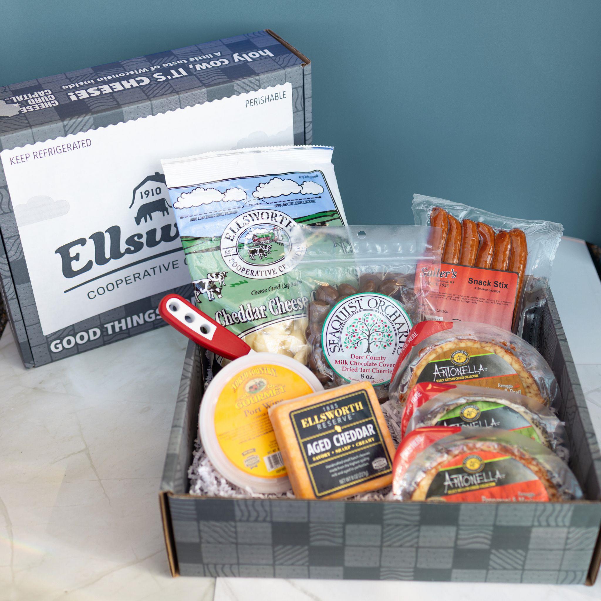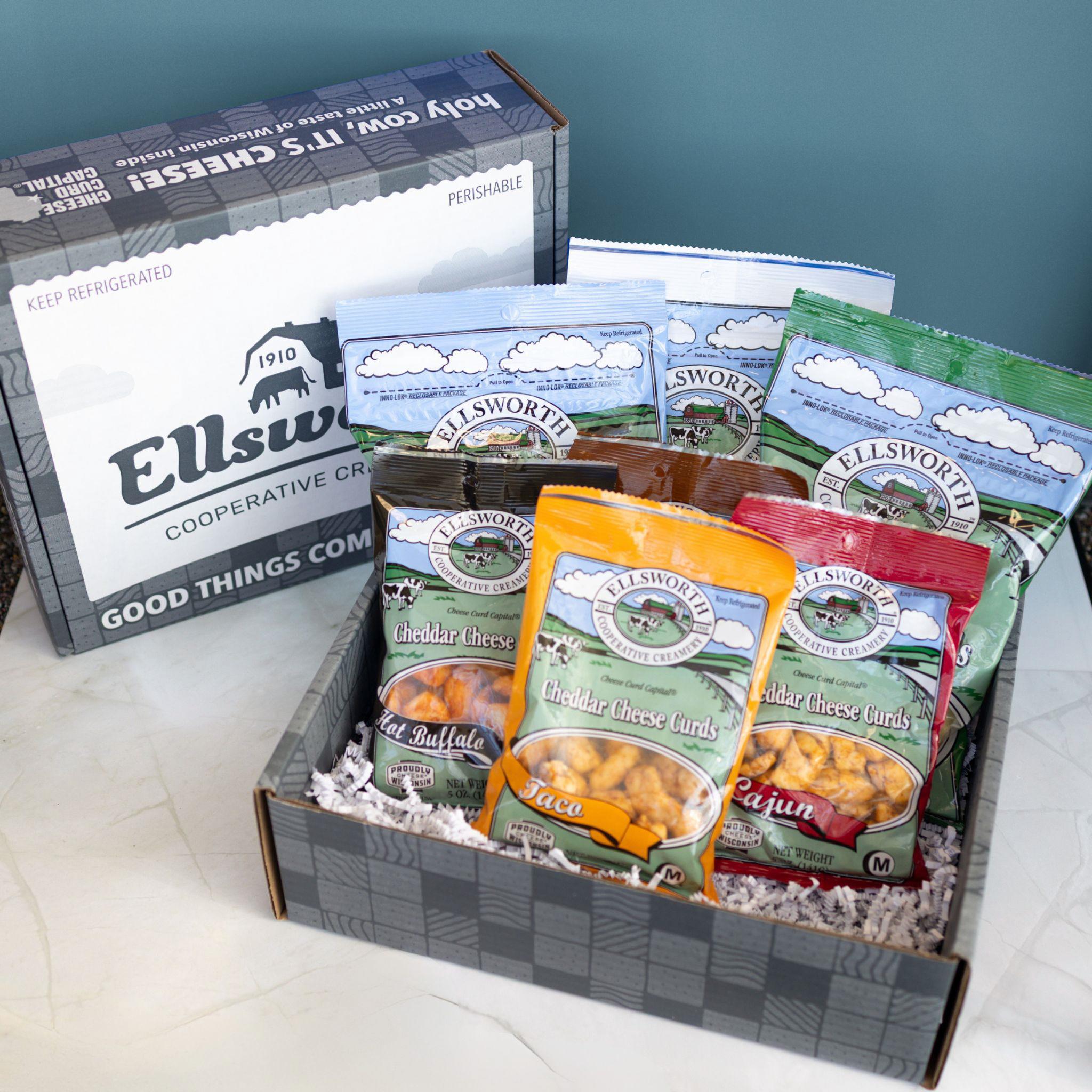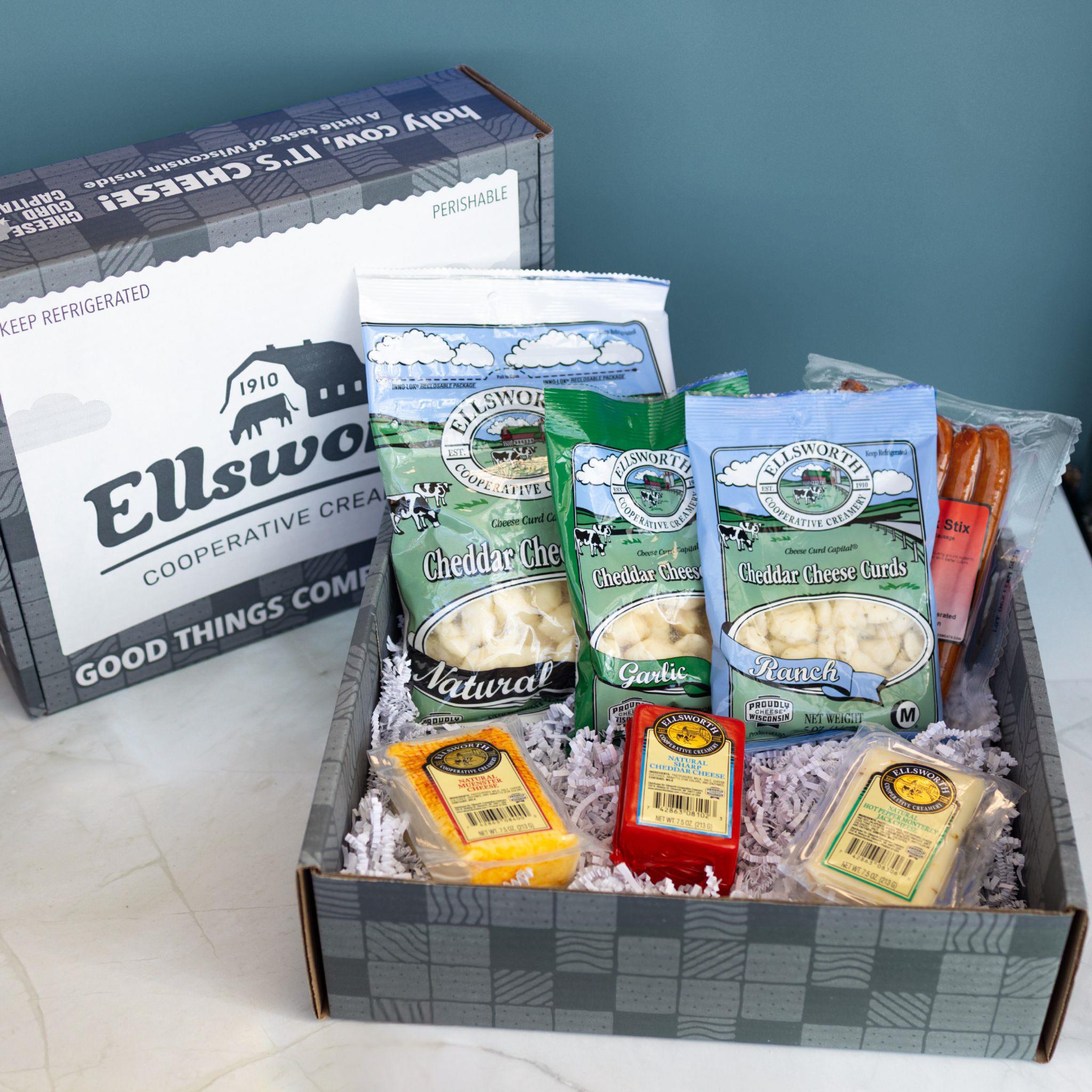 Includes 16oz Natural Curds, 16oz Dill Curds, 16oz Ranch Curds, 5oz Cajun Curds, 5oz Hickory Bacon Curds, 5oz Taco Curds, 8oz 1885 Aged Cheddar, 15.5oz Bacon Cheddar, 15.5oz Muenster, 7.5oz Salami Colby, 7.5oz Medium Cheddar, 7.5oz Extra Sharp, 7.5oz Pepper Jack, Sailer’s Regular Summer Sausage, Seaquist Chocolate Cherries, and Thick N Thin Slicer.