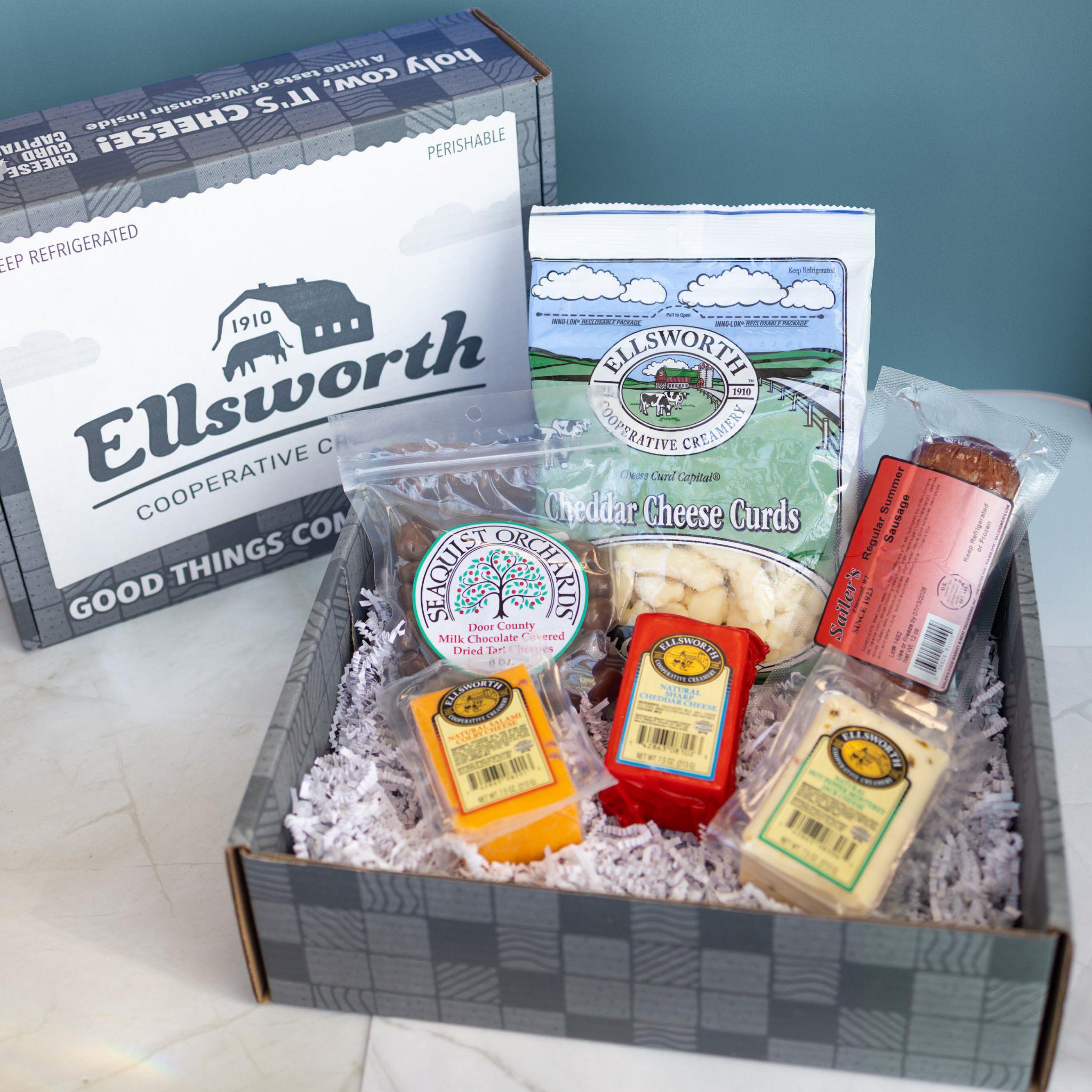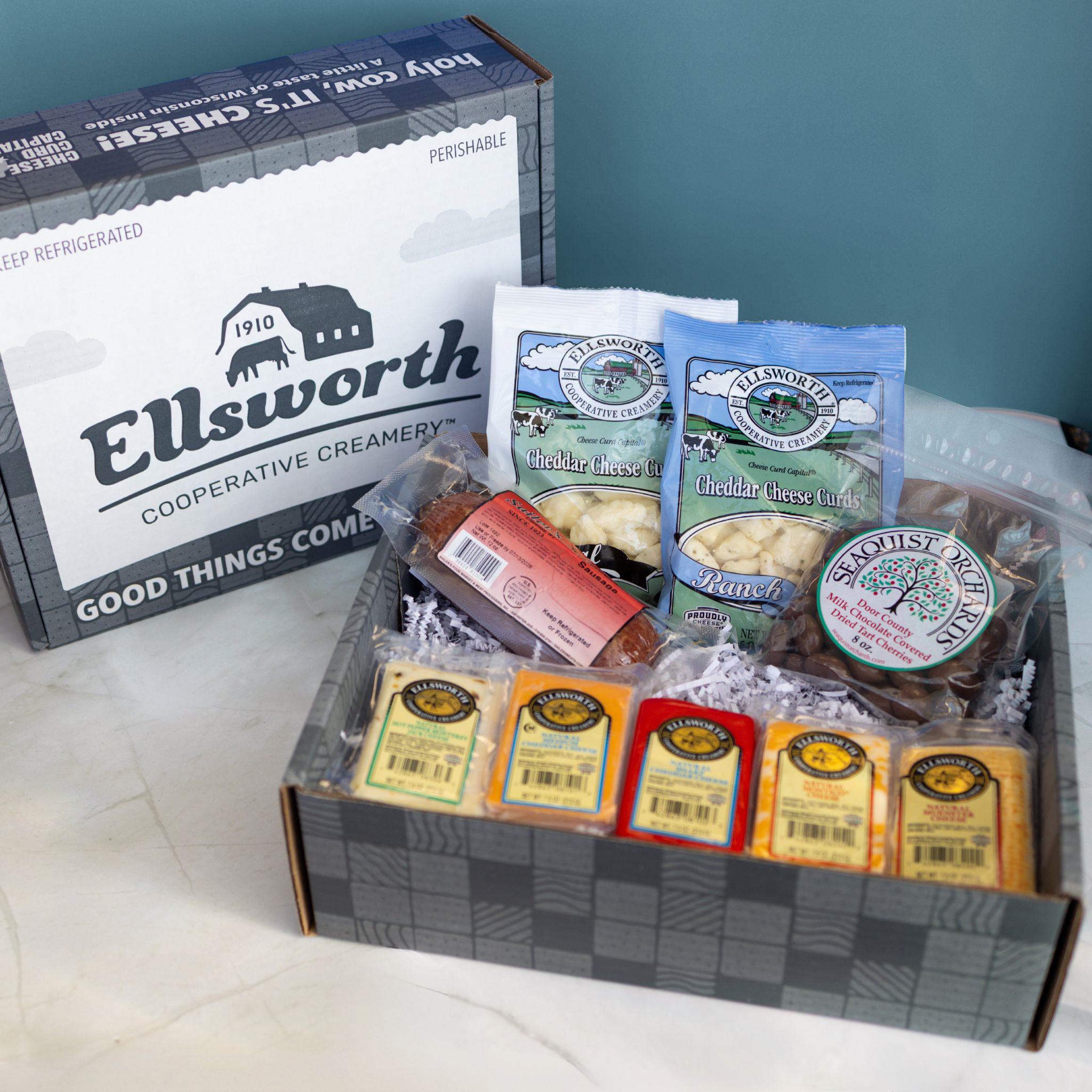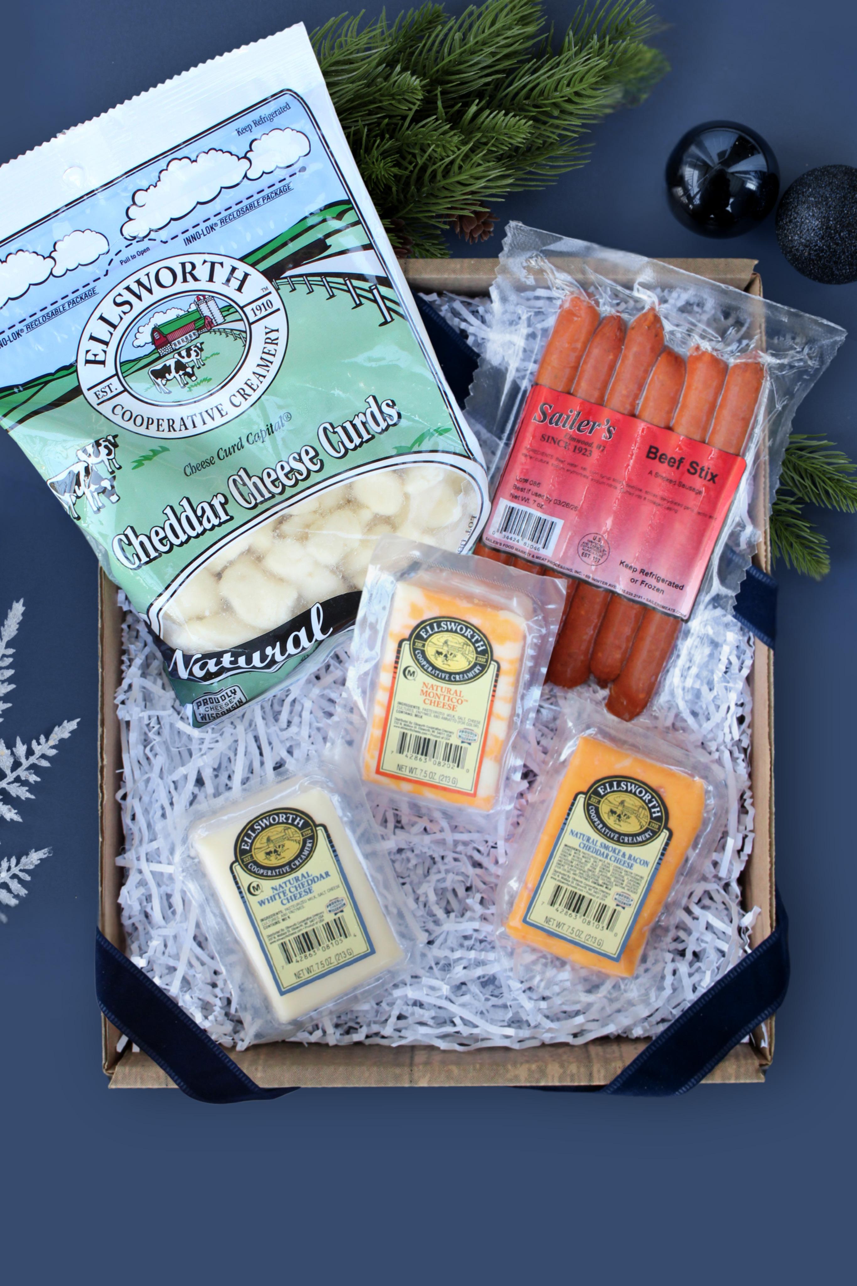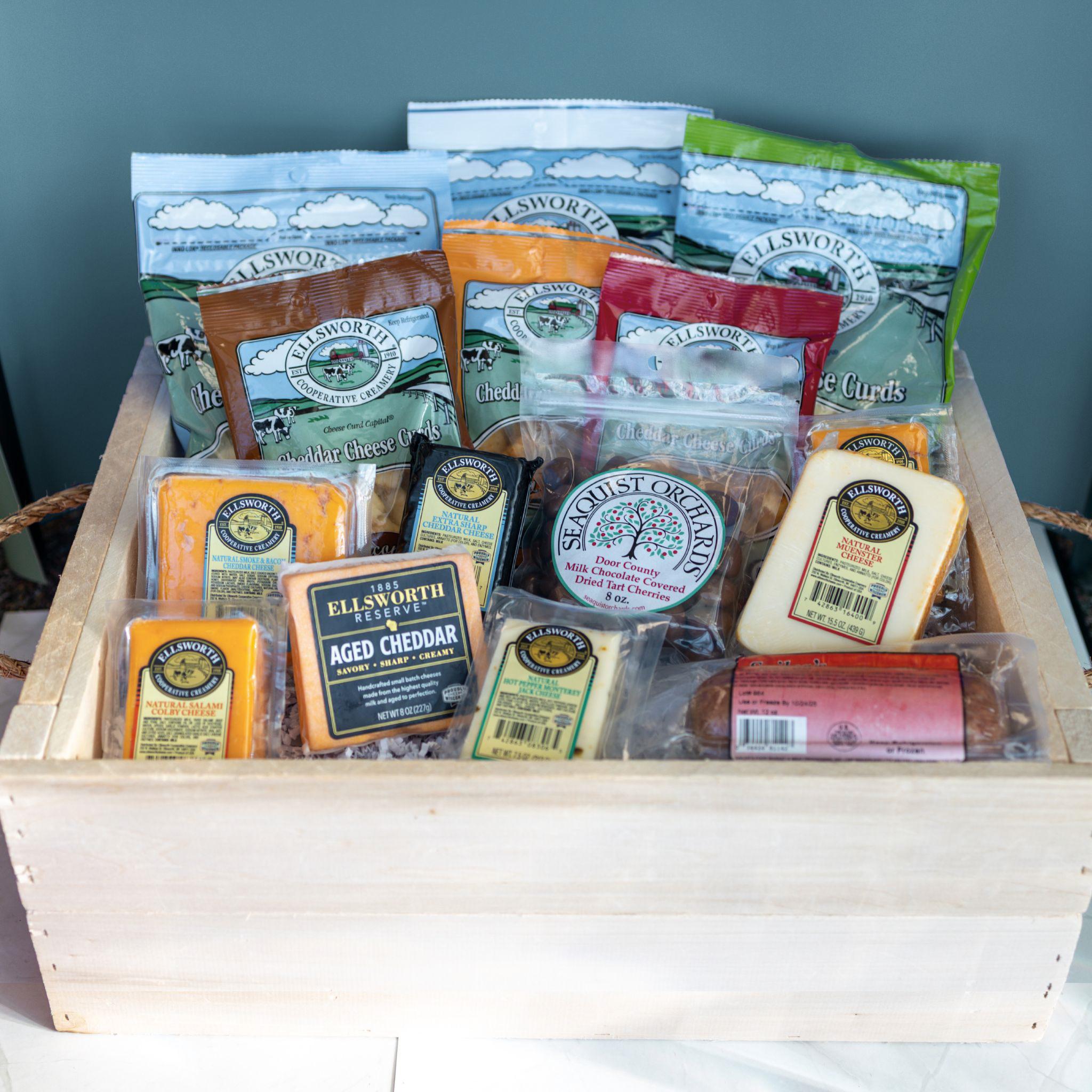 Includes 5oz Natural Curds, 5oz Ranch Curds, 7.5oz Medium Cheddar, 7.5oz Sharp Cheddar, 7.5oz Montico, 7.5oz Pepper Jack, 7.5oz Muenster, Sailer’s Regular Summer Sausage, and Seaquist Chocolate Cherries.