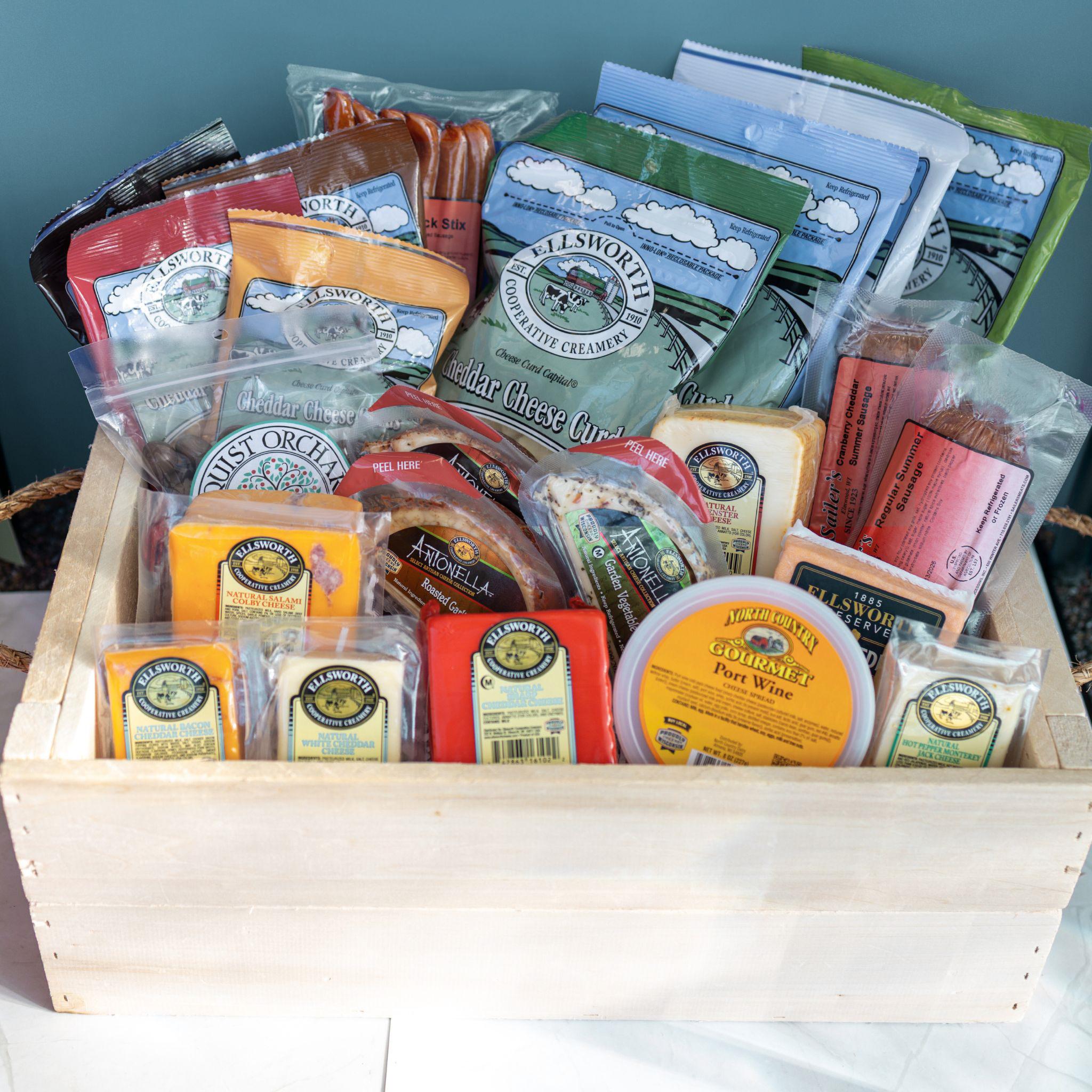 Includes 16oz Natural Curds, 16oz Garlic Curds, 16oz Ranch Curds, 16oz Dill Curds, 5oz Hot Buffalo Curds, 5oz Hickory Bacon Curds, 5oz Taco Curds, 8oz 1885 Aged Cheddar, 8oz Antonella Roasted Garlic, 8oz Antonella Pepperoni, 8oz Antonella Garden Vegetable, 15.5oz Sharp Cheddar, 15.5oz Muenster, 15.5oz Colby, 15.5oz Salami Colby, 7.5oz Pepper Jack, 7.5oz Montico, 7.5oz White Cheddar, 7.5oz Bacon Cheddar, North Country Port Wine Spread, North Country Sharp Cheddar Spread, Sailer’s Beef Sticks, Sailer’s Cranberry Summer Sausage, Sailer’s Regular Summer Sausage, Seaquist Chocolate Cherries, and a Beechwood Slicer.