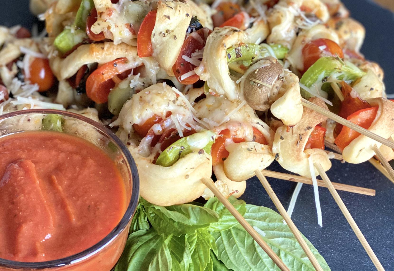 Pre-heat your oven to 400°. Thread your wooden skewers with tomatoes, bell peppers, mushrooms, olives, pepperoni, and basil. Flour your countertop and roll out pizza dough. Slice dough into 1/2 “ strips and wrap around veggies. In a small bowl combine olive oil and Italian Seasoning. Baste each skewer. Place on a parchment lined baking sheet and bake until pizza dough is golden brown, about 15 minutes. Remove and sprinkle with Antonella cheese. Place back in the oven and bake for 5 more minutes. Serve with pizza sauce. Adapted from a recipe by Living with Landyn