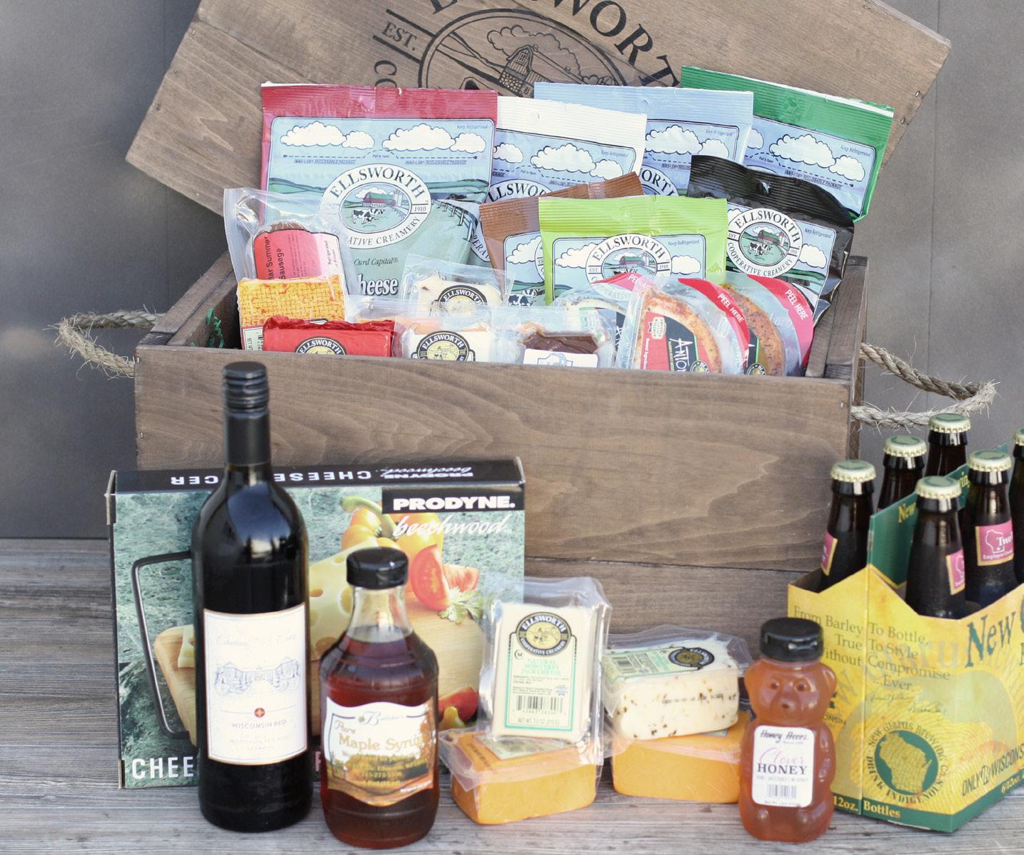Ellsworth Elite Includes Ellsworth Natural Cheese Curds, Garlic Cheese Curds, Dill Pickle Cheese Curds, Ranch Cheese Curds, Cajun Cheese Curds, Antonella Garden Vegetable, Antonella Pepperoni Marinara, Monterey Jack, Colby, Cranberry Monterey Jack, White Cheddar, Medium Cheddar, Smoke N Bacon Cheddar, Hot Pepper Jack, Bacon Cheddar, Sharp Cheddar, Red Rind Muenster, Hot Buffalo Curds, Hickory Bacon Curds, Antonella Roasted Garlic& Tomato Basil, Summer Sausage, Local Honey, Flo’s Fudge, Beachwood Slicer, New Glarus Beer 6-Pack, Local Maple Syrup, and a bottle Chateau St Croix Wine. Only available in-store. $299