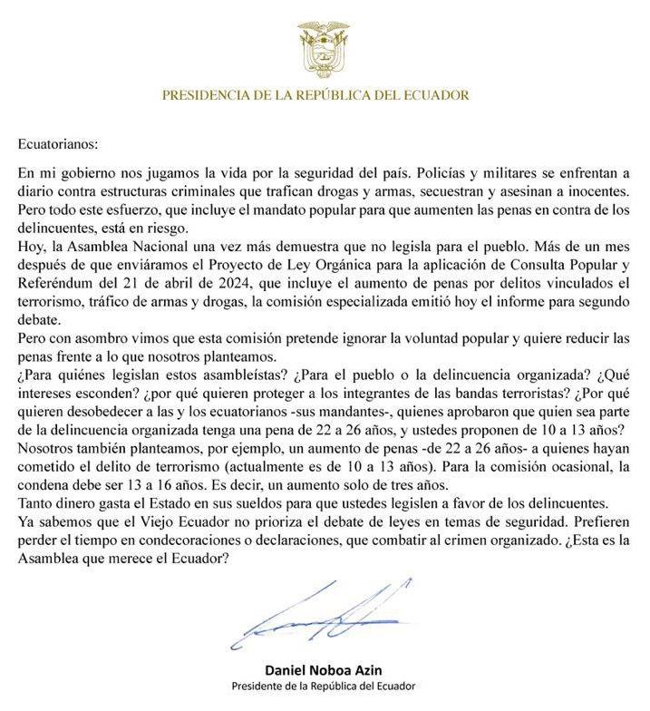 El presidente de la República, Daniel Noboa mediante un comunicado, enviado hoy, 29 de junio de 2024, criticó la pretensión de la comisión especial que estudia las reformas de la Consulta Popular y que plantea disminuir las penas en contra de la decisión popular que solicitó el incremento de las penas.
