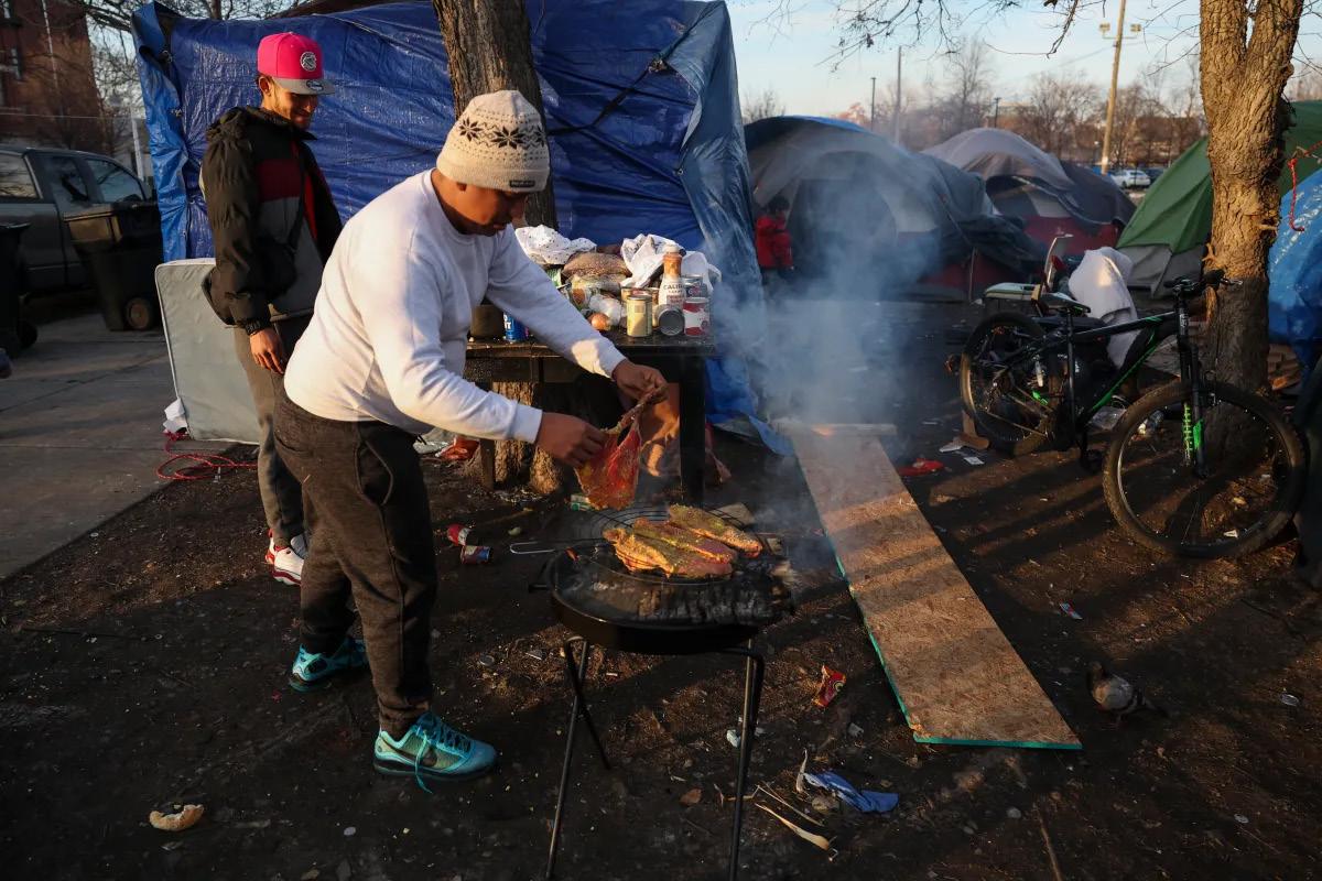 En cambio, el joven de 25 años y sus amigos, dos inmigrantes venezolanos, consiguieron una tienda de campaña lo suficientemente grande para los tres, la fortificaron con palos de madera, la envolvieron en una lona para protegerla de la lluvia y el frío, y Coloqueon alfombra en el suelo. También agregaron un microondas y una nevera pequeña, convirtiéndola en su hogar afuera de la estación de policía del distrito de Deering (noveno).