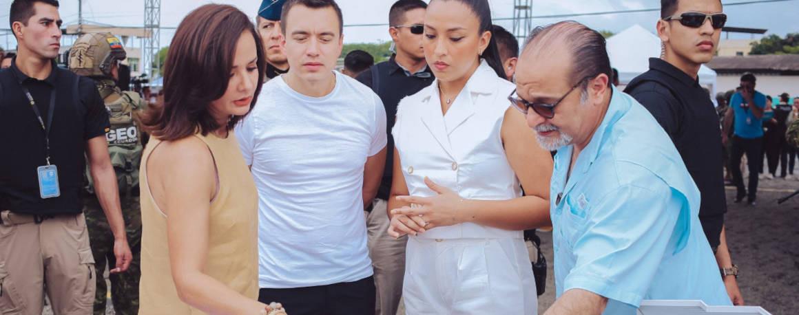 El presidente Daniel Noboa y la prefecta Marcela Aguiñaga colocaron la primera piedra del conjunto habitacional en El Triunfo, el 8 de marzo de 2024.Foto: @PrefGuayas