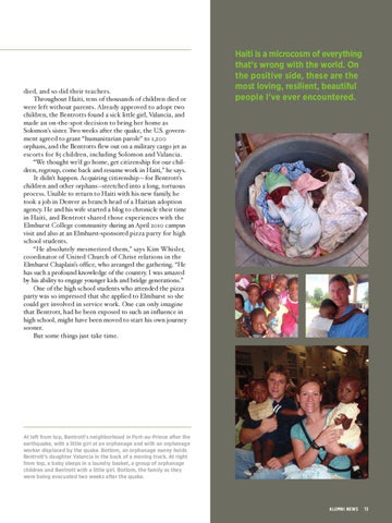 died, and so did their teachers. Throughout Haiti, tens of thousands of children died or were left without parents. Already approved to adopt two children, the Bentrotts found a sick little girl, Valancia, and made an on-the-spot decision to bring her home as Solomon’s sister. Two weeks after the quake, the U.S. government agreed to grant “humanitarian parole” to 1,200 orphans, and the Bentrotts flew out on a military cargo jet as escorts for 85 children, including Solomon and Valancia. “We thought we’d go home, get citizenship for our children, regroup, come back and resume work in Haiti,” he says. It didn’t happen. Acquiring citizenship—for Bentrott’s children and other orphans--stretched into a long, tortuous process. Unable to return to Haiti with his new family, he took a job in Denver as branch head of a Haitian adoption agency. He and his wife started a blog to chronicle their time in Haiti, and Bentrott shared those experiences with the Elmhurst College community during an April 2010 campus visit and also at an Elmhurst-sponsored pizza party for high school students. “He absolutely mesmerized them,” says Kim Whisler, coordinator of United Church of Christ relations in the Elmhurst Chaplain’s office, who arranged the gathering. “He has such a profound knowledge of the country. I was amazed by his ability to engage younger kids and bridge generations.” One of the high school students who attended the pizza party was so impressed that she applied to Elmhurst so she could get involved in service work. One can only imagine that Bentrott, had he been exposed to such an influence in high school, might have been moved to start his own journey sooner. But some things just take time.
