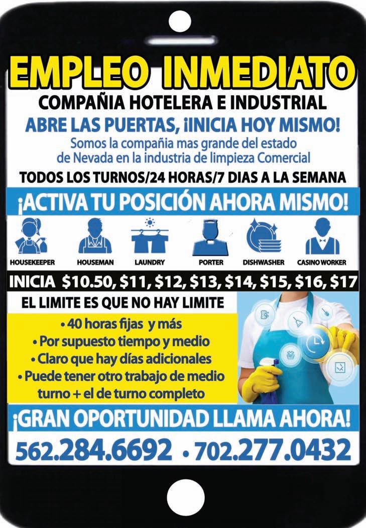 Personal de limpieza para tiempo parcial y tiempo completo. Interesados favor de mandar mensaje de texto al (702) 5056770 de Lunes a Viernes, de 8 am a 5 pm, con su nombre y teléfono y nosotros nos contactaremos con usted para programar una entrevista. Sueldo depende de experiencia, comenzando de $11.50 hasta $14 dólares por hora. (10/28)