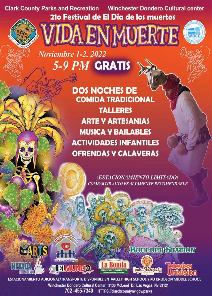 Llega el esperado Festival Vida en muerte en el Winchester Dondero Cultural Center, días primero y dos de noviembre, desde las 5 a las 9 de la noche. Gracias so bre todo al entusiasmo y empuje de Irma Varela. A disposición del público activida des para niños, ofrendas y calaveras, arte y artesanía, comida, premiaciones. Cita en el 3130 McLeod Dr. Las Vegas, Nevada 89121. Más detalles en el (702) 455-7340. El estacio namiento es limitado. Acuda temprano.