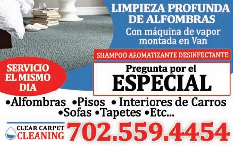 Limpieza profunda de alfombras, con máquina de vapor montada en van, cepillado, shampoo, aromatizante, desinfectante. Limpiamos pisos, interiores de carros, sofás, etc. Servicios mismo día. Llamar al teléfono (702) 5594454. (05/31)