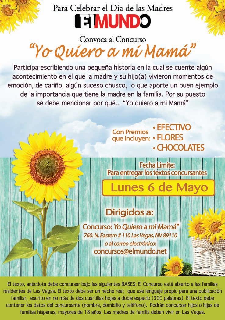 Muy bien puede ser una anécdota, describir un momento trascendental, familiar, emotivo, esos que marcan para siempre, con mamá como protagonista. Ellas lo merecen todo, deje constancia de su cariño, de lo que ella significa para usted. Las madres son guía, apoyo, muchas veces la mejor amiga, sencillamente la heroína del núcleo familiar. Dígaselo. No es un secreto que una madre tiene algo de Dios y mucho de ángel. Debe enviar su texto (contentivo de unas 300 palabras, dos cuartillas) a nuestras oficinas, localizadas en: 760 al norte de la Eastern. Suite 110. Las Vegas, Nevada 89110. Fecha límite para la recepción el 6 de mayo. O al correo electrónico: concursos@elmundo.net