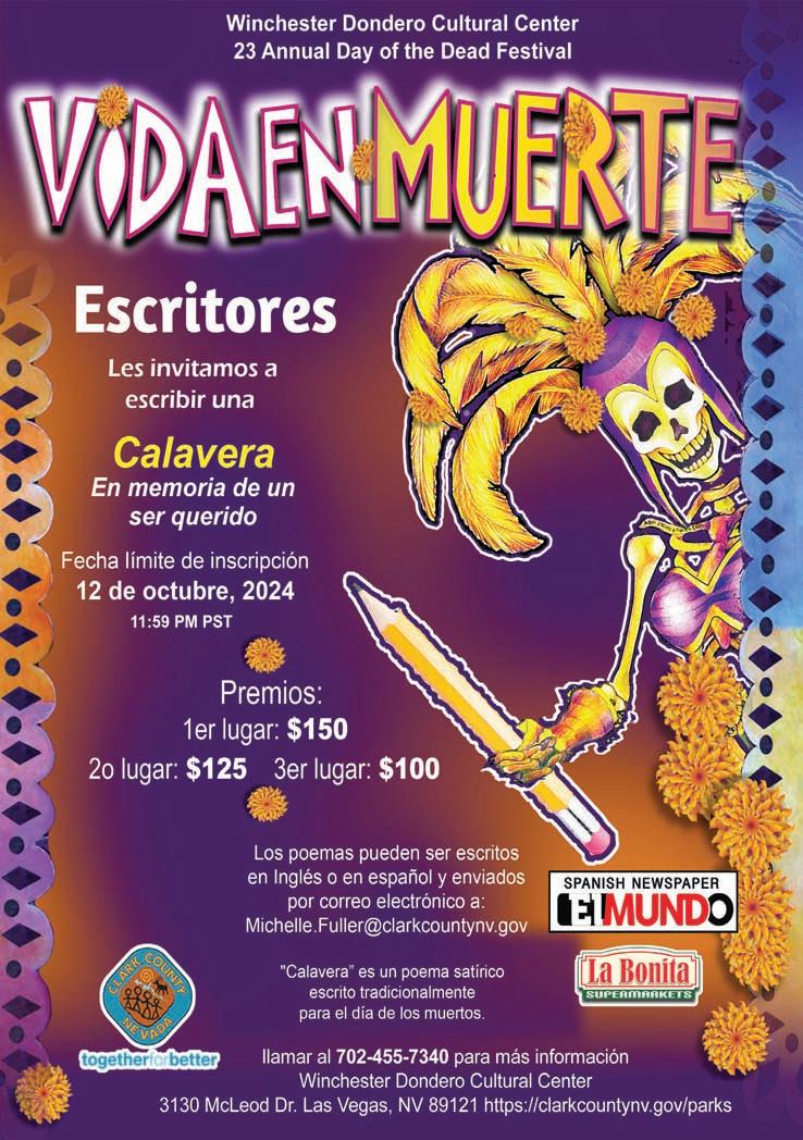 El Mundo invita a los lectores a participar con sus calaveritas por el llamado Día de Muertos. Los interesados pueden enviar su texto a más tardar el 17 de octubre a: concursos@elmundo.net o al 760 N. Eastern. Suite 110. Las Vegas, Nevada 89101. Premio: dinero en efectivo y publicación.