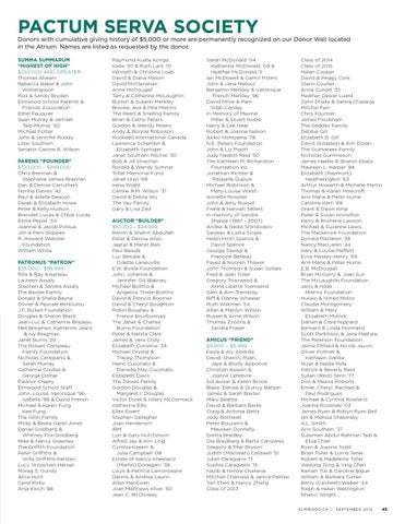 Raymond Kuate Konga Katie ’97 & Ruth Lark ’10 Kenneth & Christina Loeb David & Diana Mason David McClenahan Anne McDougall Terry & Catherine McLaughlin Burton & Susann Merkley Brooke, Ava & Mila Mierins The Peers & Snelling Family Brian & Cathy Peters Gordon & Wendy Peters Andy & Bonnie Robinson Rockwell International Canada Lawrence Schembri & Elizabeth Springer Janet Southam Ritchie ’30 Bob & Jill Strachan Ronald & Wendy Sumner Toller Memorial Fund Janet Uren ’68 Irena Wight Cairine R.M. Wilson ’31 David & Debra Wu The Yau Family Gary & Lisa Zed AUCTOR “BUILDER” $10,000 – $24,999 Rahim & Shahin Abdullah Peter & Denise Allen Jagtar & Manjit Basi Paul Beaulé Luc Berube & Odette Laneuville E.W. Bickle Foundation John, Johanna & Jennifer ’04 Blakney Michael Bolitho & Angelica Thiele-Bolitho David & Patricia Boomer David & Cheryl Boughton Robin Boushey & France Bourbonnais The Janet & Charles Burns Foundation Peter & Nenita Clark James & Vera Cody Elizabeth Coristine ’34 Michael Crystal & Tracey Thompson Mario Cuconato & Danielle May-Cuconato Elizabeth Davis The Dawes Family Gordon Douglas & Margaret I. Douglas Victor Duret & Hilary McCormack Katherine Ellis Ellen Ewert Stephen Gallagher Joan Henderson IBM Lori & Gary Hutchinson Alfred Jay & Kim Ling Cynthia Kasem & Julia Campbell ’08 Estate of Nancy Kneeland (Martin) Donegani ’38 Louis & Patricia Lamontagne Dennis & Andrea Laurin Allan MacEwen Joan Matthews Khan ’50 Jean C. McCloskey