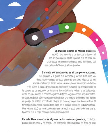 En muchos lugares de México existe una tradición viva que viene de tiempos antiguos: el son, música que se canta y poesía que se baila. De entre todos los sones mexicanos, este libro habla del son del sur de Veracruz, el son jarocho. El mundo del son jarocho es el campo veracruzano, sus paisajes y la gente que lo trabaja y lo vive. Está lleno, en tierra, cielo y aguas, de toda clase de animales. Muchos de los animales del campo tienen su son. A veces, hasta se arriman a la tarima y se suben a bailar, disfrazados de bailadores humanos. La fiesta jarocha, el fandango, se da alrededor de la tarima. Los músicos la rodean y los bailadores, arriba de ella, marcan el compás a golpes de tacón. Algunos sones son de montón, es decir, los bailan sólo mujeres; otros los bailan una mujer y un hombre y se llaman de pareja. En el libro encontrarás dibujos en blanco y negro que los muestran. El fandango suena mejor lejos de todo ruido de la ciudad, y lejos de toda luz artificial. Una vez me tocó ver una luciérnaga que se había metido dentro de una jarana, haciendo que la boca del instrumento resplandeciera. En este libro encontrarás algunos de los animales jarochos, no todos, porque son muchos y no caben. Los escogimos entre Caterina, es decir, yo que 4