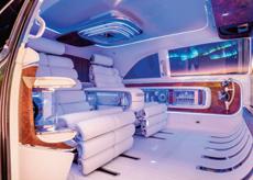 Su consola central esta diseñada como armario, con un panel táctil para controlar el sistema de infoentretenimiento y una mesa desplegable. Cuando se extiende, la mesa parece como un tablero de ajedrez, y se mueve automáticamente al reclinar el asiento.