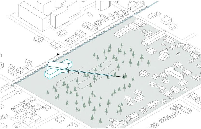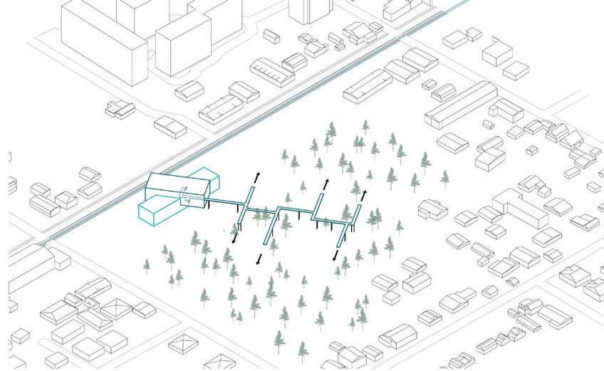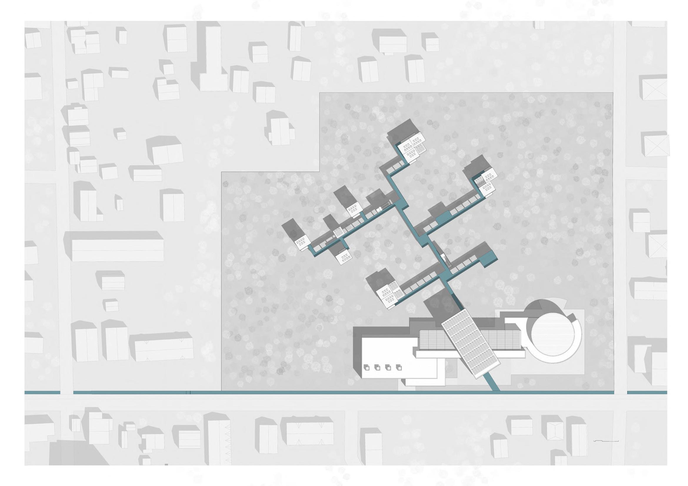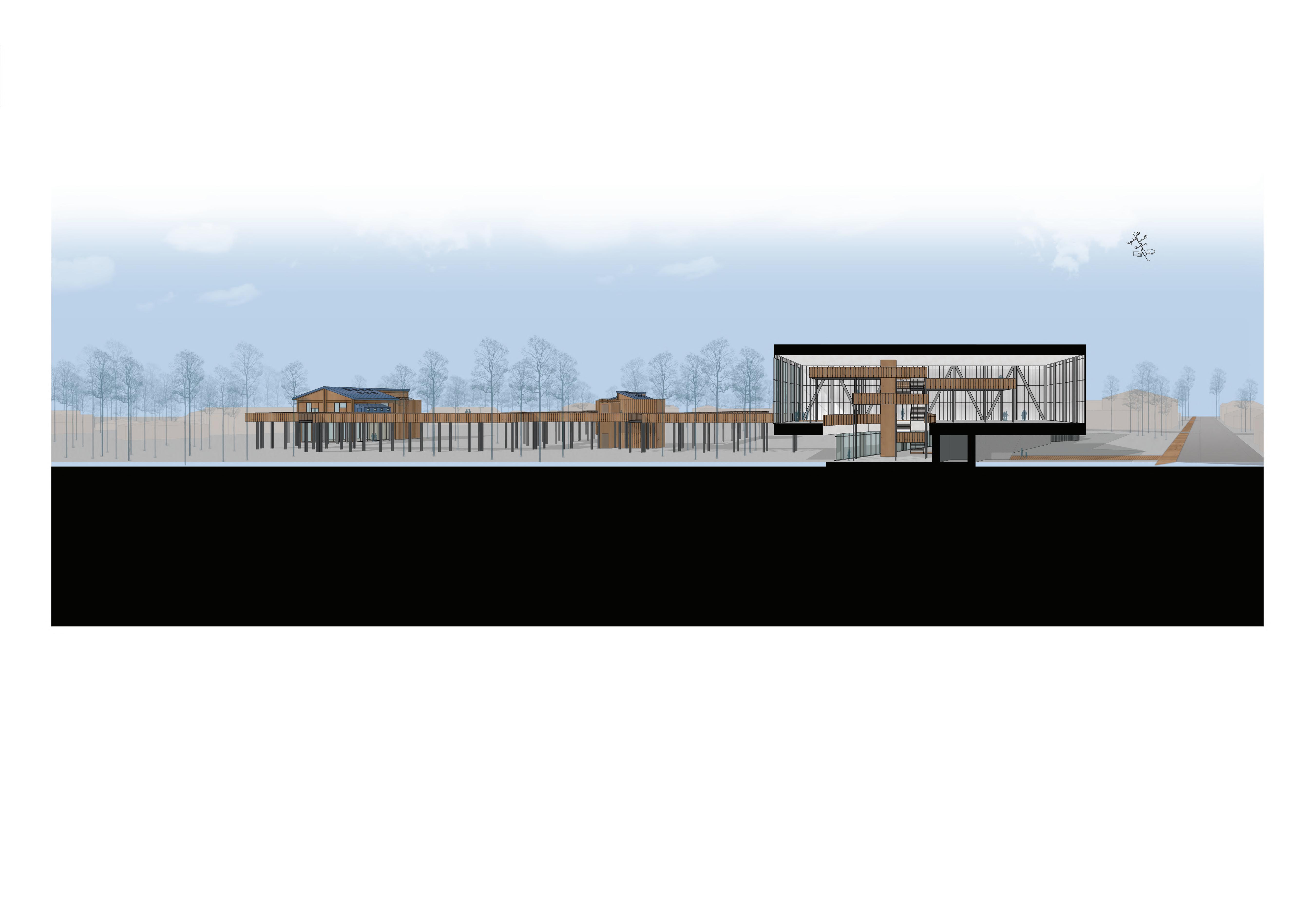 Ce projet cherche à renforcer l’unité de la ville, créant une connexion entre une zone résidentielle et le centre-ville. L’architecture du bâtiment s’inspire des tracés urbains de la ville, qui ont servi de point de départ aux volumes qui sont situés et intégrés dans une zone boisée d’Irpin. Dans l’objectif de minimiser l’impact sur ce terrain naturel, un élément a été placé au cœur du projet : la passerelle, qui prend naissance au cœur du centre et se poursuit dans les bois, créant un parcours social et culturel.