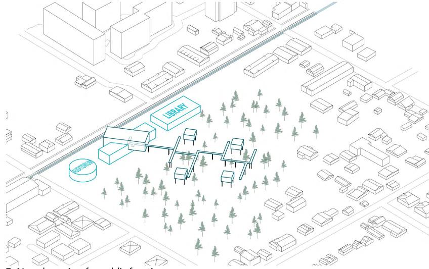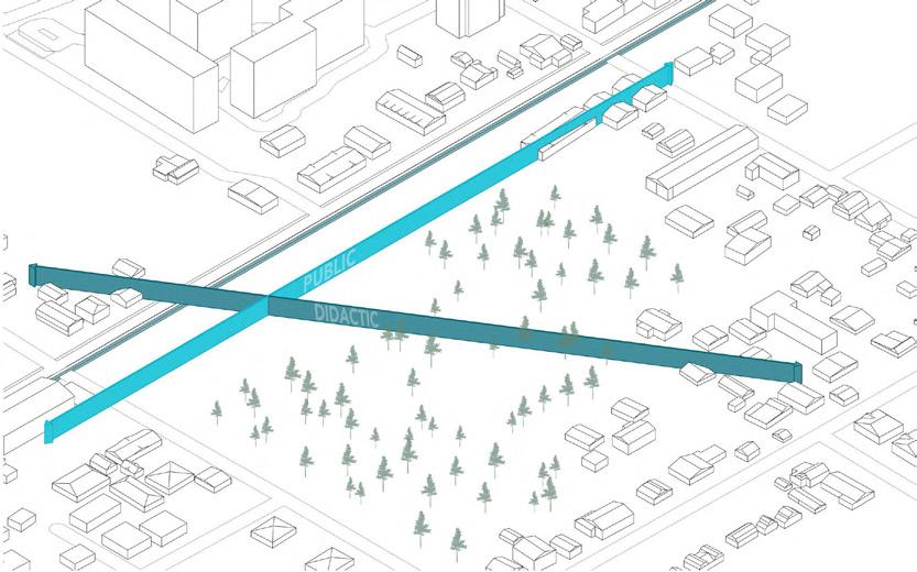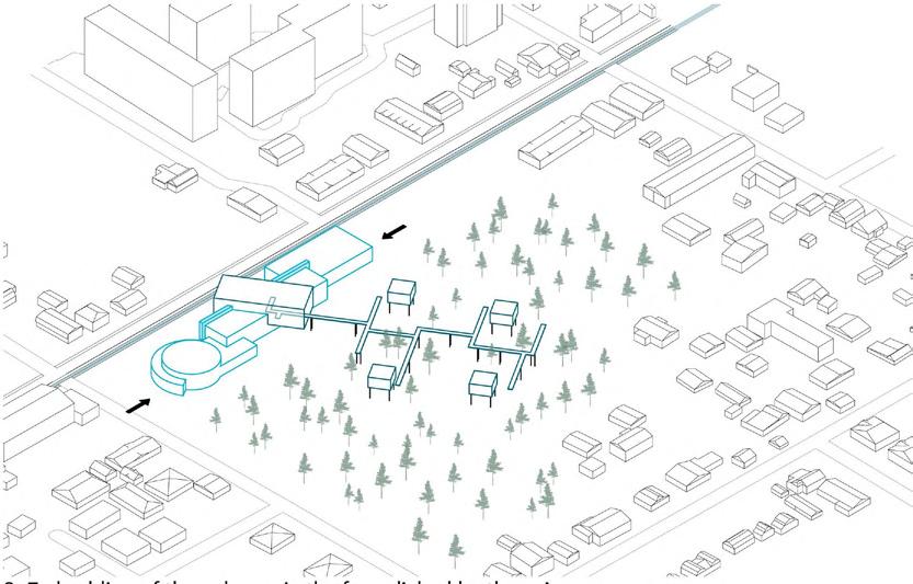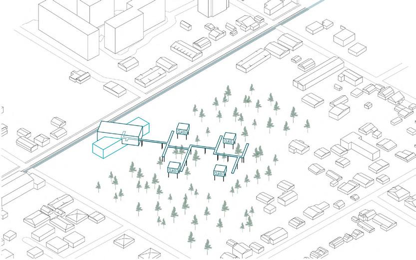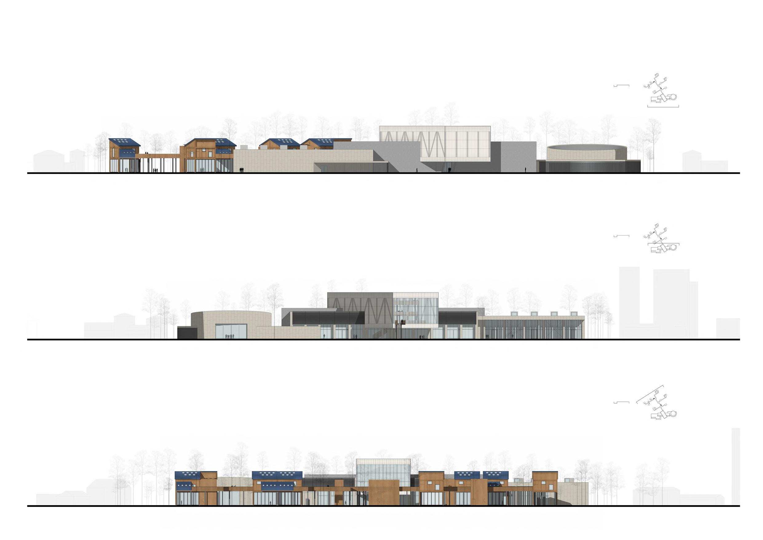 Ce projet cherche à renforcer l’unité de la ville, créant une connexion entre une zone résidentielle et le centre-ville. L’architecture du bâtiment s’inspire des tracés urbains de la ville, qui ont servi de point de départ aux volumes qui sont situés et intégrés dans une zone boisée d’Irpin. Dans l’objectif de minimiser l’impact sur ce terrain naturel, un élément a été placé au cœur du projet : la passerelle, qui prend naissance au cœur du centre et se poursuit dans les bois, créant un parcours social et culturel.