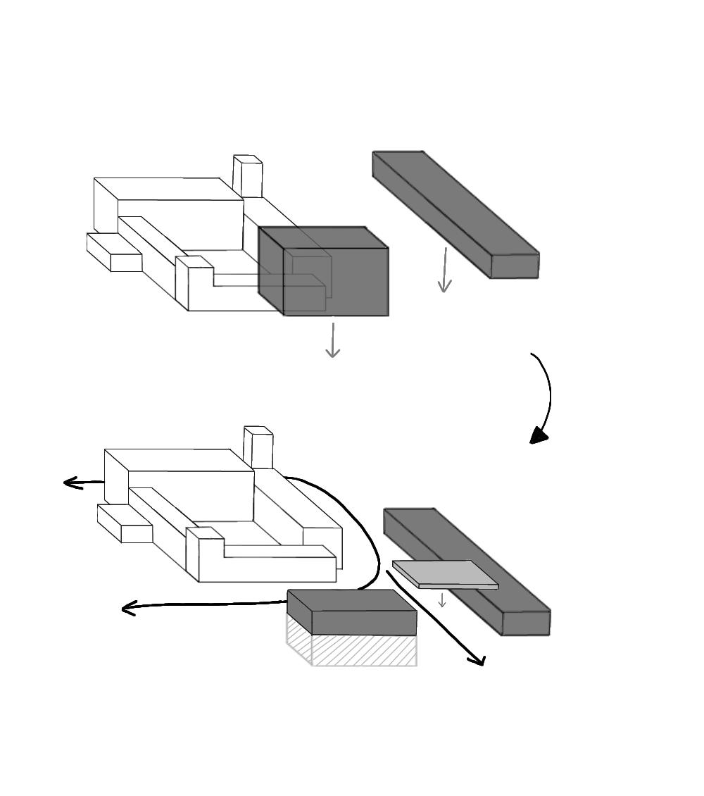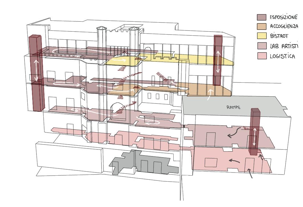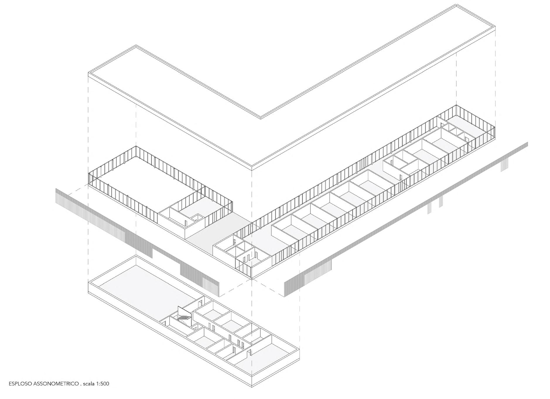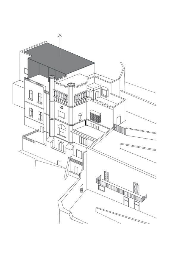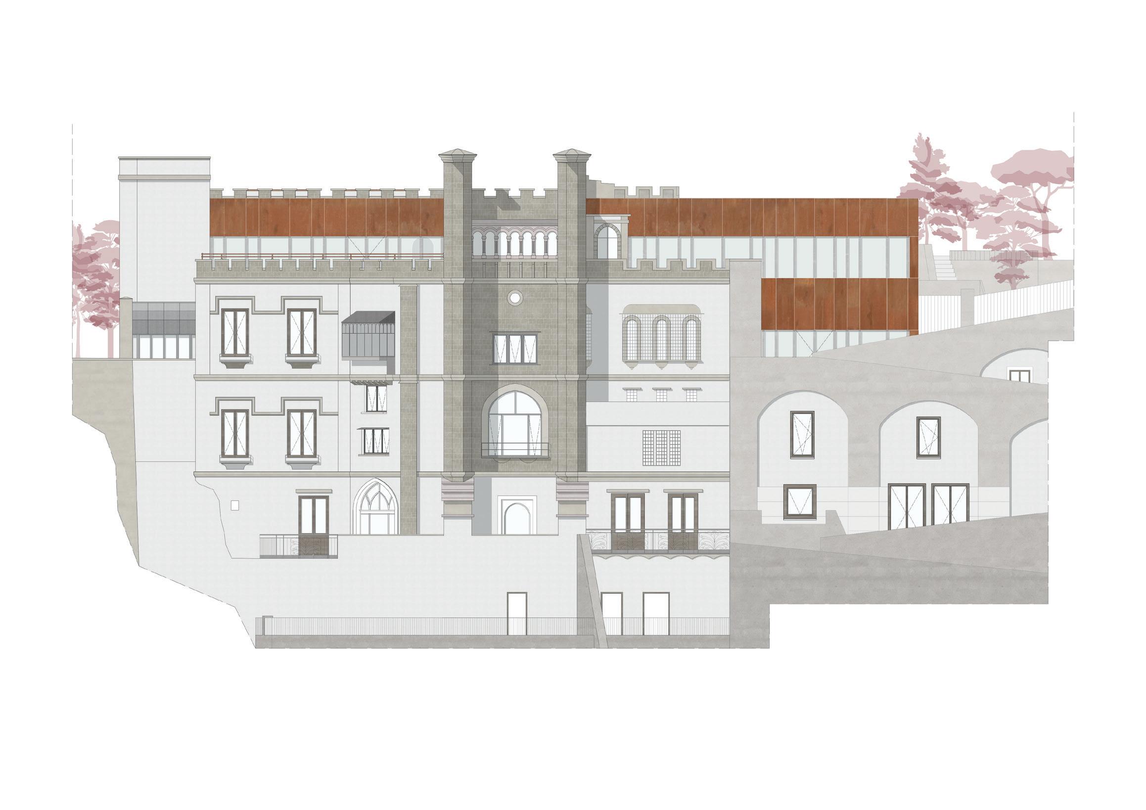 La villa Ebe, conçue par l’architecte Lamont Young en 1920, est située dans le centre historique de la ville de Naples, et est dans un état d’abandon depuis un important incendie en 2000. Ce projet prévoit la réhabilitation de la villa en un musée sur le street art napolitain, auxquels sont rattachés des ateliers visitables destinés à des artistes locaux. Les parties encore reconnaissables de l’édifice sont restaurées et une nouvelle architecture est ajoutée aux parties détruites. J’ai étudié la conception originale de l’édifice ainsi que son état de dégradation afin d’orienter les choix conceptuels et de développer les solutions constructives pour l’ajout des nouveaux sols, plafonds et volumes.