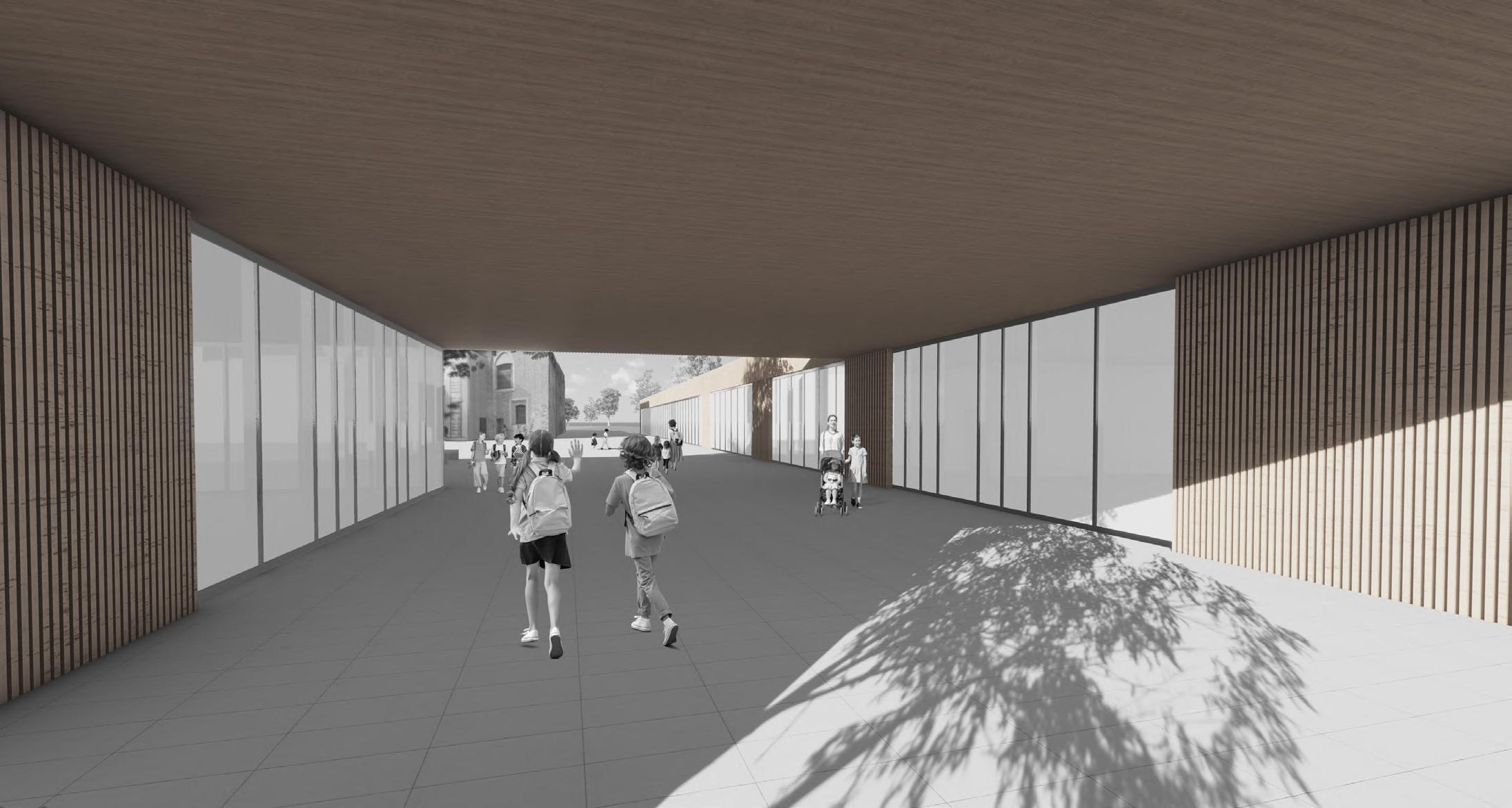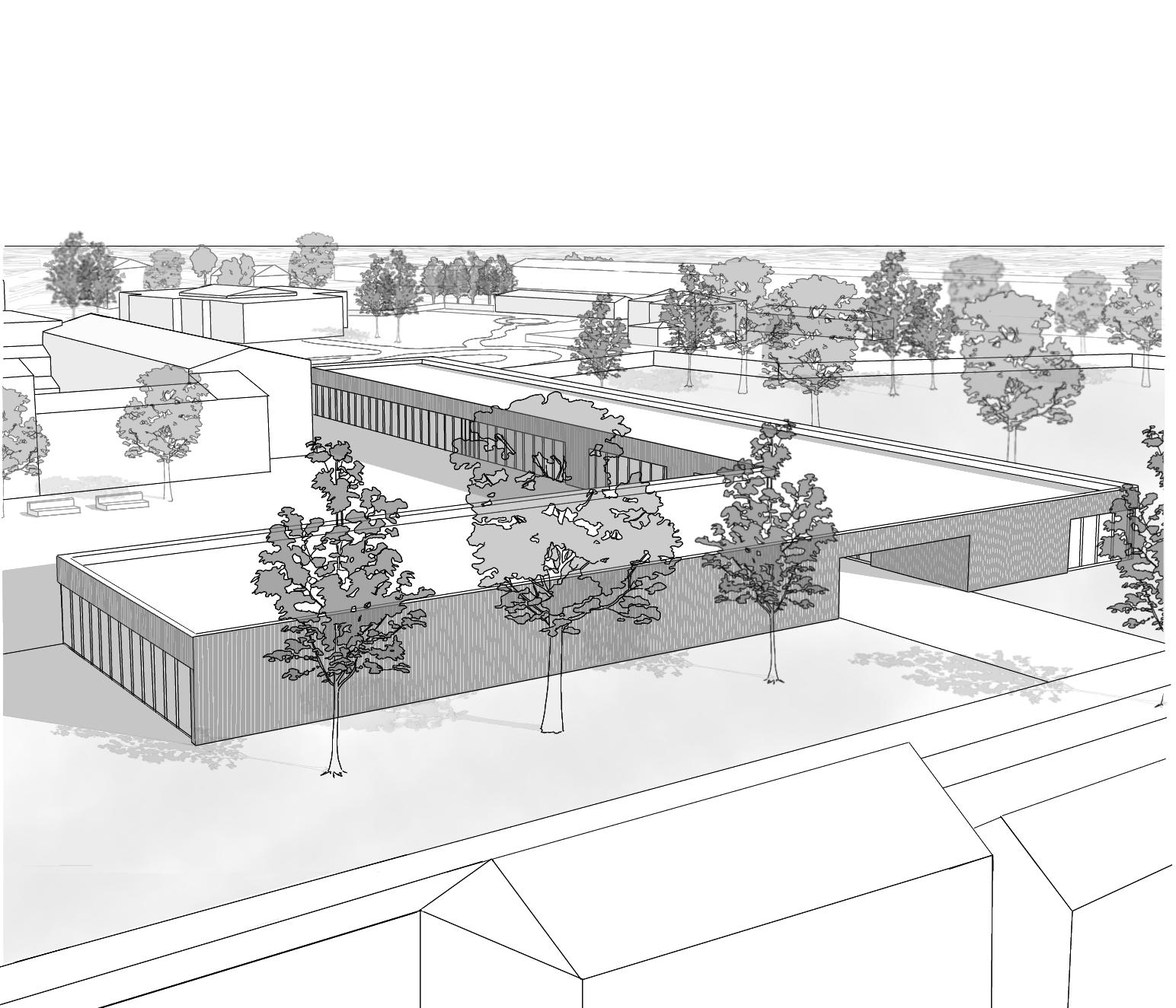 Le cahier des charges précis a mené au développement d’un bâtiment en deux parties, rejointes par un passage couvert, et donnant naissance à un nouveau parcours et place publique entourant