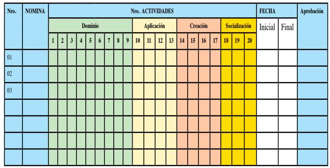 El docente realizará el seguimiento permanente del cumplimiento de actividades de la guía, a través de un cuadro que consta de los siguientes aspectos: número de orden; nómina de estudiantes; número secuencial de actividades por fases del conocimiento; fecha inicial y fecha final del desarrollo de la guía; y aprobación final. Cada actividad lograda o desarrollada de manera adecuadamente, se registrará con la letra “A” mayúscula de “Aprobado”.