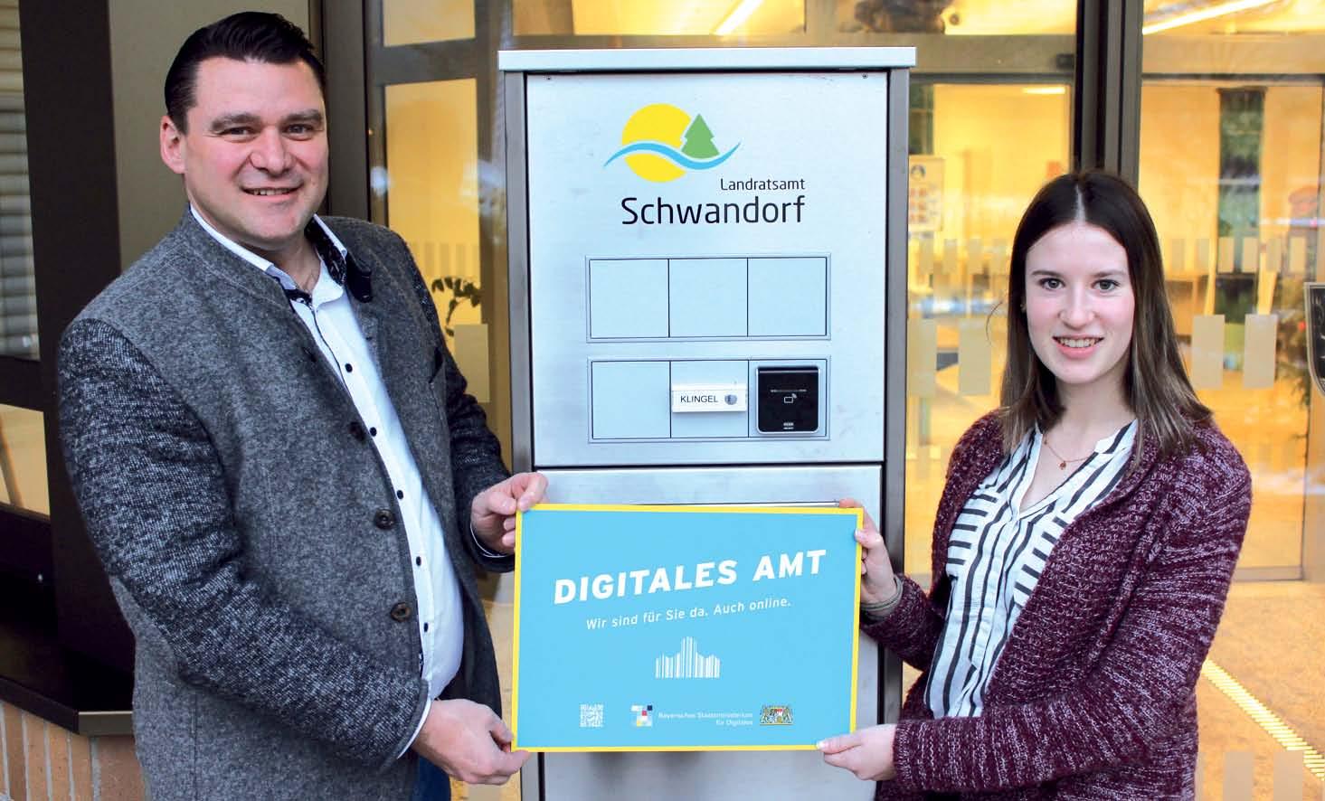 Landrat Thomas Ebeling und Digitalisierungsbeauftragte Luisa Zwick freuen sich über die Auszeichnung des Landratsamtes als „Digitales Amt“. Foto: Hans Prechtl, Landratsamt Schwandorf