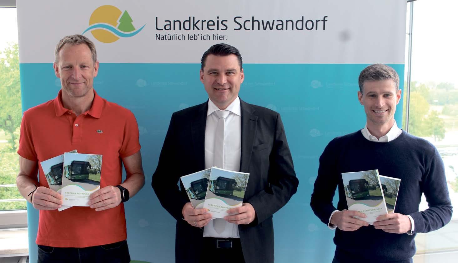 Sachgebietsleiter für Kreisentwicklung Christian Meyer, Landrat Thomas Ebeling und ÖPNVBeauftragter Dominik Hauser (von links) stellen den Taschenfahrplan 2024 vor. Foto: Hans Prechtl, Landratsamt Schwandorf