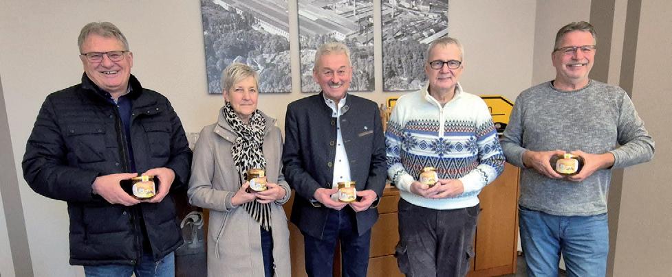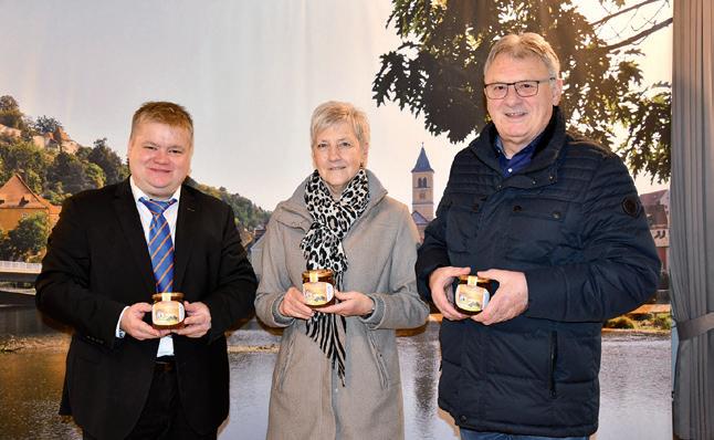 Eine lange Tradition wird auch 2025 fortgesetzt: Bürgermeister Thomas Gesche, Imkerverein Vorsitzender Michael Schöberl und seine Vertreterin Elfriede Marek bei der Übergabe der Honiggläser. Foto: Ulrike Pelikan