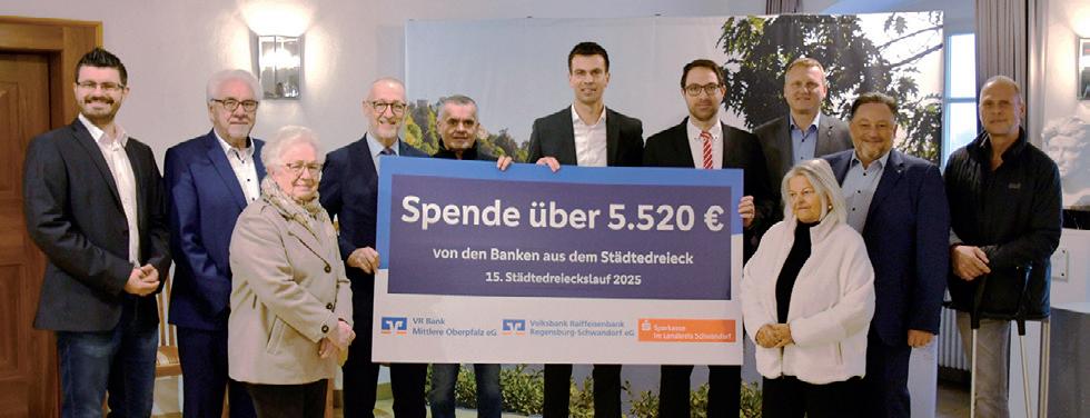 STÄDTEDREIECK (sr). Dank sportlicher Ausdauer und starken 736 Teilnehmerinnen und Teilnehmer am 15. Städtedreieckslauf sowie der großzügigen Unterstützung der regionalen Banken wurde erneut eine Rekordsumme erzielt. Anfang November 2025 wurde im Burglengenfelder Rathaus eine beeindruckende Summe von über 5.500 Euro an die Tafel im Städtedreieck übergeben. Damit wurde der bisherige Spendenrekord der vergangenen Jahre erneut übertroffen. Der stolze Betrag ist das Ergebnis des Städtedreieckslaufs, der alljährlich zahlreiche Walking- und Laufbegeisterte sowie Kinder und Jugendliche anzieht. Unter dem Motto „Gemeinsam ins Ziel“ fand dieser heuer am 16. August statt. Für jeden Zieleinlauf spendeten die Sparkasse im Landkreis Schwandorf, die VR Bank Regensburg-Schwandorf und die VR Bank Mittlere Oberpfalz eG erneut 2,50 Euro pro Teilnehmendem.