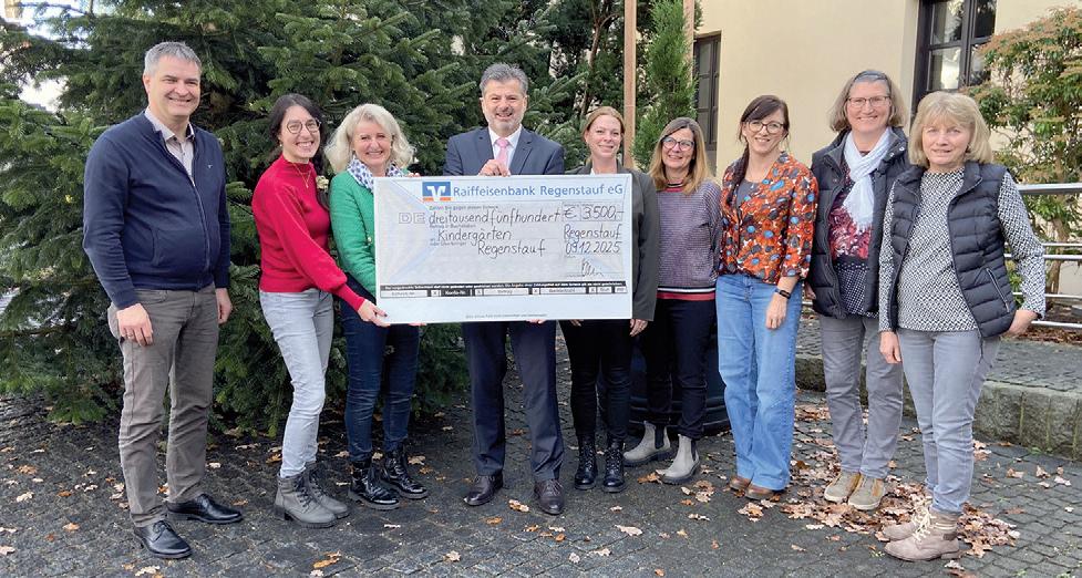REGENSTAUF (sr). Im Namen der Raiffeisenbank übergab Wolfgang Haas, Vorstand der Raiffeisenbank Regenstauf eG, am 9. Dezember 2025 symbolisch einen Scheck über 3.500 Euro an die Kindertagestätten des Marktes Regenstauf. Die Bank fördert jedes Jahr gemeinnützige Einrichtungen und Vereine in ihrem Geschäftsgebiet mit Spenden von insgesamt über