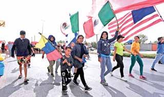 Con las banderas de Estados Unidos, México y Venezuela, los migrantes caminaron por la avenida Bernardo Norzagaray en Juárez, la cual está a metros del muro que divide a México y Estados Unidos.
