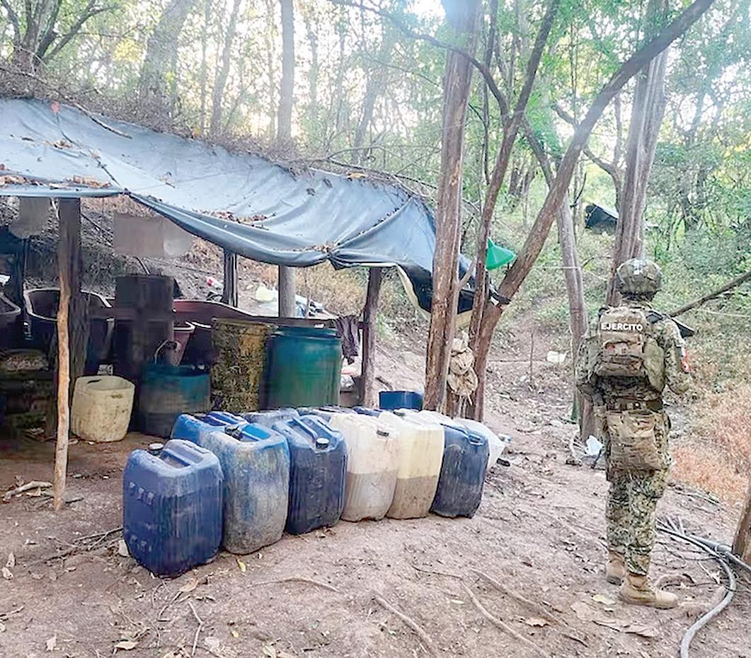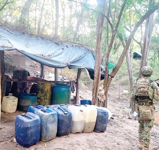 En los poblados de Corral Viejo y Las Juntas, en el municipio de Culiacán, el personal militar descubrió un laboratorio clandestino y tres áreas de concentración de diversas sustancias, en donde se aseguró un volumen total de 4 mil 90 litros de una sustancia líquida aún no identificada.