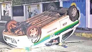 Huixtla, Chiapas; 3 de Diciembre de 2022.- Un taxi del sitio ‘Huixtla’ terminó volcado sobre las principales calles de la cabecera, como referencia a la altura del Instituto; no se reportaron personas lesionadas, solo