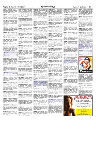 JETTA 2008, Trendline, 56,000 VENDO Civic Honda 2012, kilómetros, conservado, único PAYASITO Tiko, ofrece VENDO Chevy modelo 2004, blanco, automático, 11,000 dueño, buen precio. Teléfono animación, sonido, magia, kilómetros recorridos. 62-598cuatro puertas, clima, único 11-840-49, 962-152-77-82. (07 concursos, globoflexia, dueño, remato $33,000, foto 40. (12 ENERO). ENERO). pintacaritas y cámara de whatsapp. 962-109-45-53. (08 VENDO Liberty modelo 2006, VENDO Nissan Xtrail modelo burbujas, además personajes ENERO). excelentes condiciones. 62-674- 2006, cuatro cilindros, con Mickey y el Chavo, ya cuento con show cristiano. Reservaciones 08, 962-121-79-14. (16 ENERO). REMATO Jeep Cherokee, 4x4 clima, vidrios eléctricos, todo 962-100-27-74. (05 ENERO). modelo 90, americano, cuatro pagado. Teléfono 962-113-58VENDO o cambio camión Ford puertas, cuatro cilindros, PAYASO Esponjín ofrece show, 84. (06 ENERO). modelo 2002, con caja seca, $15,000 a tratar o cambio por cómico, juegos, concursos y motor seminuevo, F-450 XL carro automático. 962 115 ¿NECESITAS dinero? Empeña globoflexia. Celular 962-130-61Diesel, en muy buenas 2281. (28 ENERO) 67 Contáctanos por whatsapp. condiciones. Vendo camioneta tu vehículo, auto, camión o (25 ENERO). motocicleta, aceptamos GRAN Cherokee 93, seis Explorer modelo 96, en muy modelos 2002 al 2014. La tasa cilindros, 4x4, cualquier buenas condiciones, seis BARRILITO Chicharrín, show doy ciertas de interés mas baja del familiar, garantizado. 962-100prueba, $36,000.00. Teléfono cilindros, mercado, 2% por semana. facilidades de pago. Teléfono 962-129-34-50. (02 FEBRERO). Citas al 962-111-21-09. Srita. 06-47, 62-534-49, 962-114-8762-513-58. (17 ENERO). 31. (20 ENERO). Edith Jiménez. (12 ENERO). VENDO Toyota 4x4, candados PAYASO Chispita, globoflexia, manuales, el mejor modelo COMPRO carro o camioneta para rancho, llantas todo de $15,000 para abajo. 962terreno, foto whatsapp. 962- 157-35-33. (10 ENERO). 113-33-99. (08 ENERO). VENDO o rento concesión, trato directo. Informes al TAURUS Ford Sable 96, Teléfono 962-122-85-38, blanco, vestidura piel, color gris, 62-300-26. (12 ENERO). excelente, $36,000. Teléfono “Me siento atrapada y... 962-121-35-93. (02 FEBRERO). quisiera escapar de la realidad” VENTA de motos Dínamo, vía VENDO una Cherokee modelo nómina, a trabajadores, policías Existe una solución a tu 2000, todo pagado, con clima, del estado, burócratas, SNTE, embarazo color blanco. Teléfono 962-110- INEA, UNACH, salud COBACH, 53-81. (08 ENERO). ISSSTE, CONALEP. Sin Llámanos, Absoluta enganche, te regalamos un VENDO una Explorer 2002, tanque lleno. Llámanos Celular Discreción. todo pagado, con clima, color 962-162-23-65, 962-135-57-19. 62 686 86 arena. Celular 962-110-53-81. (07 ENERO).