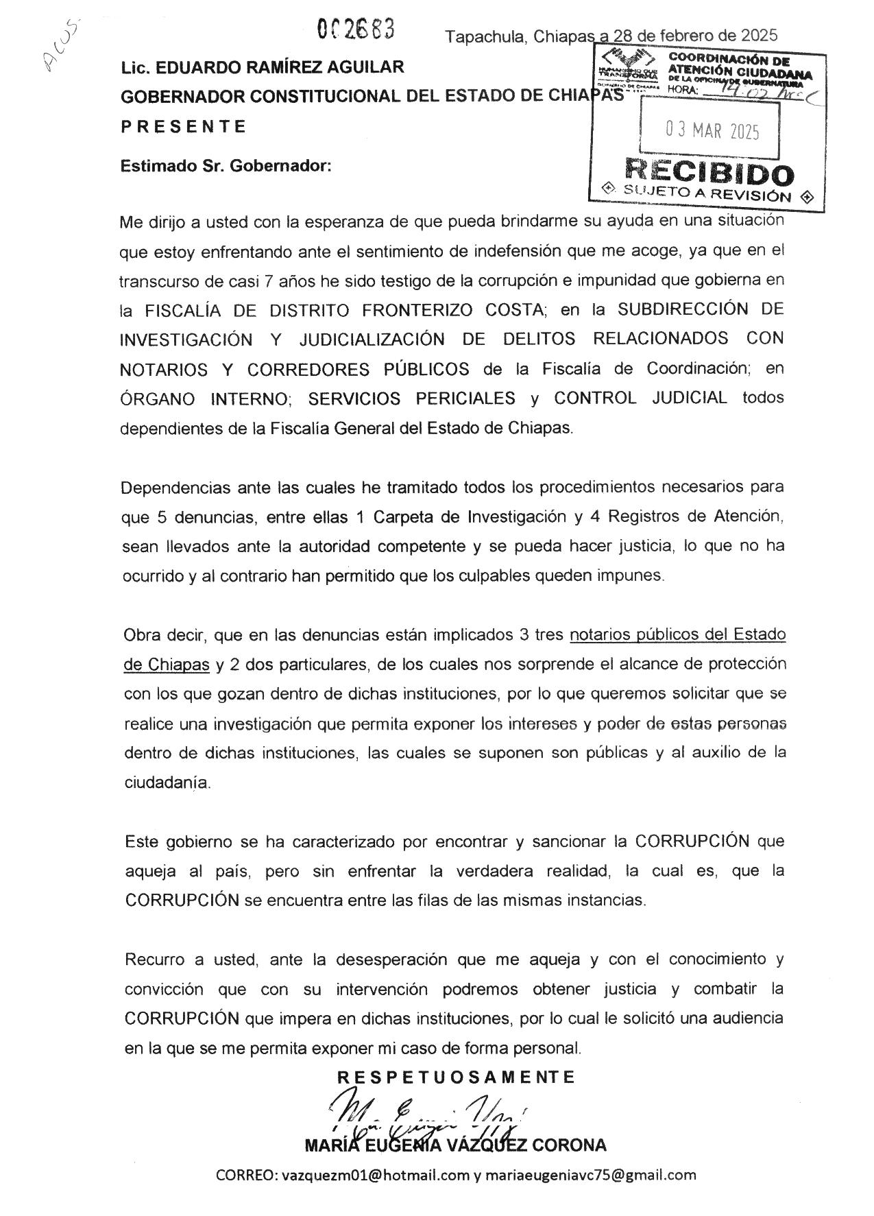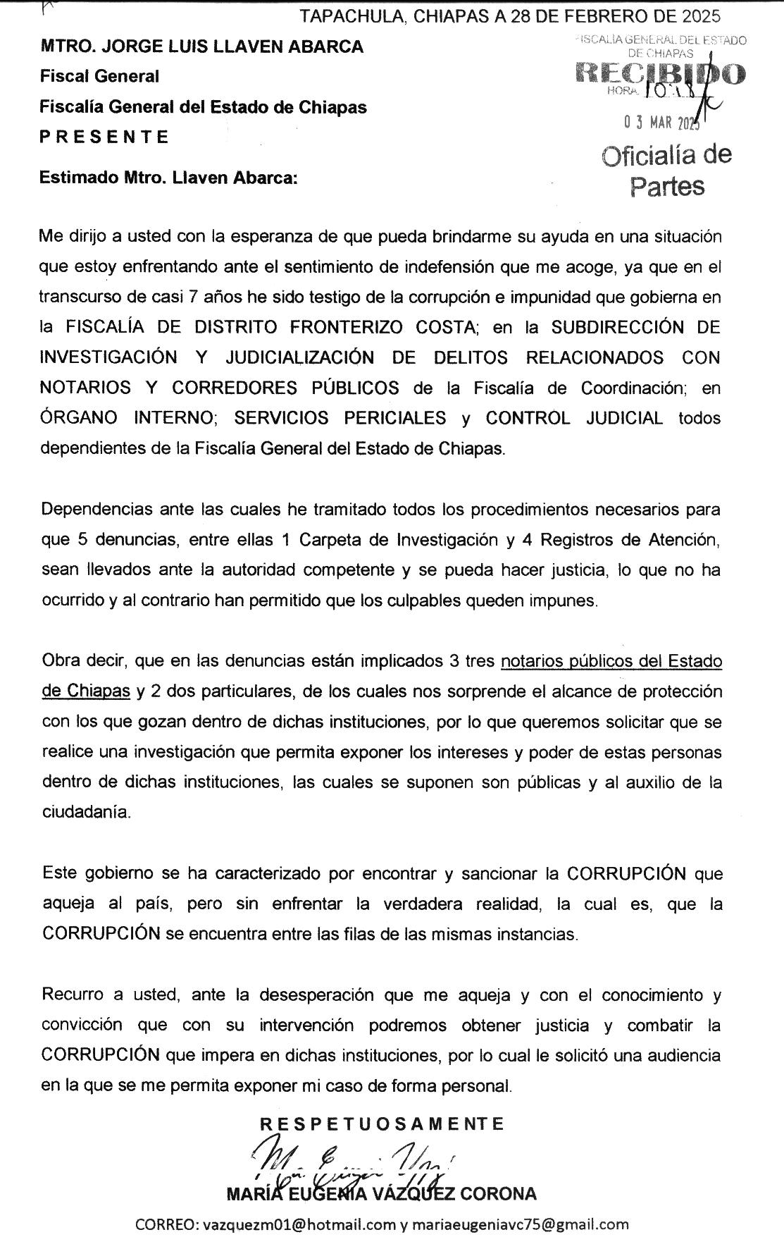 Denuncias Contra la Fiscalía Hablando de la Fiscalía, a este espacio de noticias nos hicieron llegar una denuncia pública realizada por María Eugenia Vázquez Coronado, quien ya giró oficios a diversas dependencias para señalar presuntos actos de corrupción contra funcionarios de la Fiscalía de Distrito Frontera Costa. Así como