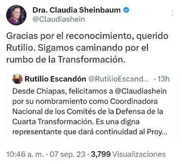 El gobernador de Chiapas, Rutilio Escandón Cadenas felicitó a Claudia Sheinbaum por ganar la encuesta interna de Morena rumbo a las elecciones 2024.