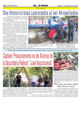 Cadáver Presuntamente es de Alumna de la Secundaria Federal “José Vasconcelos” publicaron la noticia y las fotografías, de una menor localizada en la carretera Dorado Viejo camino Cuache y camino a La Pita, dentro de la parcela propiedad del señor Francisco López. El cuerpo mostraba señas de haber sido violada ya que estaba atada con pita de pies y manos abierta de sus extremidades. Sobre los restos se distinguía el uniforme guinda característico del tercer grado de una escuela secundaria federal, el cual tenía bordado “3H”. !