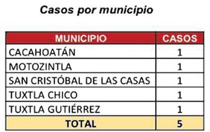 De acuerdo con el panorama epidemiológico de esta infección respiratoria, los municipios que reportaron un caso cada uno son Cacahoatán, Motozintla, San Cristóbal de Las Casas, Tuxtla Chico y Tuxtla Gutiérrez.
