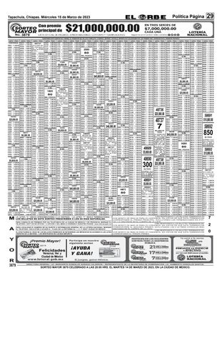 TOTALES LUGAR ACIERTOS GANADORES PREMIO INDIVIDUAL 1º 2º 3º 4º 5 Número naturales 4 Número naturales 2 Número naturales 3 Número naturales TOTALES LUGAR ACIERTOS GANADORES PREMIO INDIVIDUAL 1º 2º 3º 4º 5 Número naturales 4 Número naturales 2 Número naturales 3 Número naturales TOTALES loterianacional.gob.mx Sorteos celebrados el martes 14 de marzo de 2023 2 142 3,597 24,554 $77,997.20 $1,036.01 $44.99 $10.00 SORTEO NO. 9691 12,806 $388,736.78 28,295 $710,476.85 1,234,567 1 7 11 15 17 3 248 5,015 36,712 $88,296.38 $1,007.29 $54.80 $10.00 SORTEO NO. 9692 41,978 $1’156,639.06 6 10 18 24 27 Bolsa garantizada próximo sorteo 24.3 LUGAR ACIERTOS GANADORES PREMIO INDIVIDUAL 1º 2º 3º 4º 5º 6º 7º 8 líneas 6 líneas 5 líneas 4 líneas 3 líneas 2 líneas 1 línea 3 6 27 236 1,202 11,332 $18,926.41 $3,870.28 $1,835.97 $284.38 $65.50 $10.00 $10 PESOS $10 PESOS LUGAR ACIERTOS GANADORES PREMIO INDIVIDUAL BOLSA GARANTIZADA PRÓXIMO SORTEO 1º 2º 3º 4º 5º 6º 7º 6 Número naturales 5 Número naturales 3 Número naturales 5 Número naturales y el adicional 4 Número naturales 2 Número naturales y el adicional 1 Número natural y el adicional NATURAL NATURAL NATURAL NATURAL NATURAL NATURAL ADICIONAL 1 6 17 28 32 33 15 1 41 1,378 20,726 15,341 45,278 $88,842.93 $821.61 $144.60 $21.51 $16.13 $10.00 82,765 $1’467,834.33 TOTALES $10 PESOS MILLONES Sorteo No. 1303 Sorteo No. 2513 4 5 5 3 1 5 3 5 5 7 1 8,800 $378,809.03 7,820 $379,110.01 9,428 $1’706,493.67 12,045 $740,337.13 27,695 $3’910,783.01 8 6 2 3 5 8 0 7 7 0 3 3 1 5 9 3 7 1 3 5 2 5 GANADORES TOTAL A REPARTIR GANADORES TOTAL A REPARTIR GANADORES TOTAL A REPARTIR GANADORES TOTAL A REPARTIR GANADORES TOTAL A REPARTIR El nuevo adicional de tu sorteo favorito SORTEO NO. 30234 SORTEO NO. 30233 SORTEO NO. 30235 SORTEO NO. 30236 SORTEO NO. 30237 MULTI PLICADOR SÍ NO SÍ NO SÍ NO SÍ NO SÍ NO MULTI PLICADOR MULTI PLICADOR MULTI PLICADOR MULTI PLICADOR